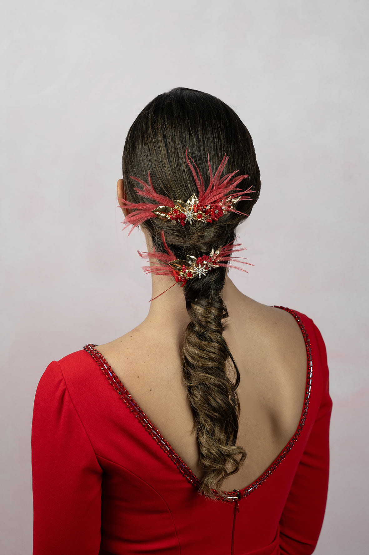 Dúo de peinas joya metálicas en oro y rojo, lleva hojas, flores de metal y terciopelo, con piedrecitas y brillos. Las dos peinas llevan manojos de plumas de avestruz rojas con peinas ambas. Miden 12cm y 8cm aprox.