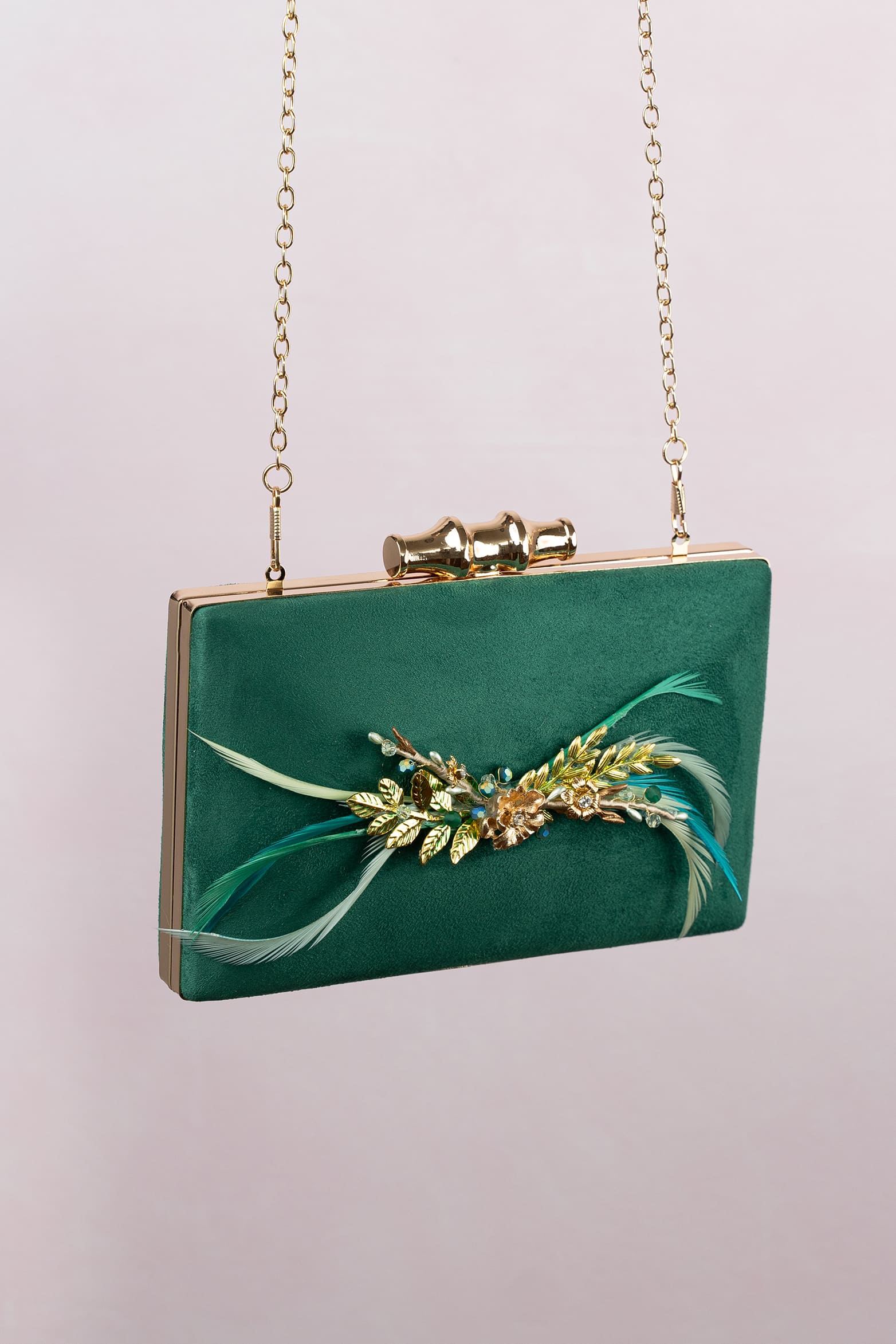 Bolso rectangular verde con aplicación en el centro de piezas metálicas, algunas teñidas, con brillos, en tonos verdes. Lleva cierre y cadena en oro Mide 20*14 cm.