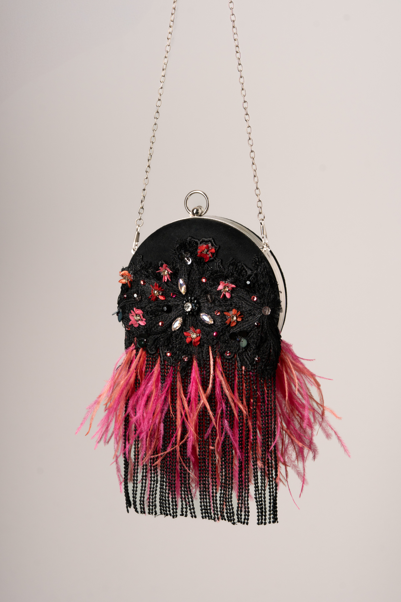 Bolso redondo en negro, forrado en encaje con flequitos y decorado con flores de brillos en tonos rosa y rojo, bolitas y chatones alargados. Plumas de avestruz para dar el contraste de color anaranjado y fresa. Med. 16cm. X27cm. X5cm. Aprox.