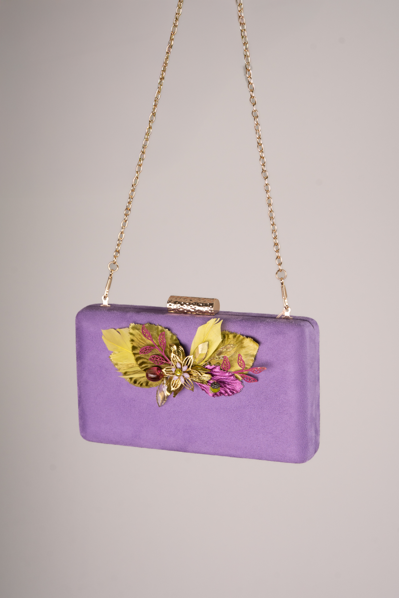 Bolso rectangular en color morado y cierre en dorado. Adorno central con flores de metal dorado y hojas pintadas. Para el toque verdoso hojas y plumas en raso y polipiel. Med. 20cm. X11cm. X3,5cm. Aprox.