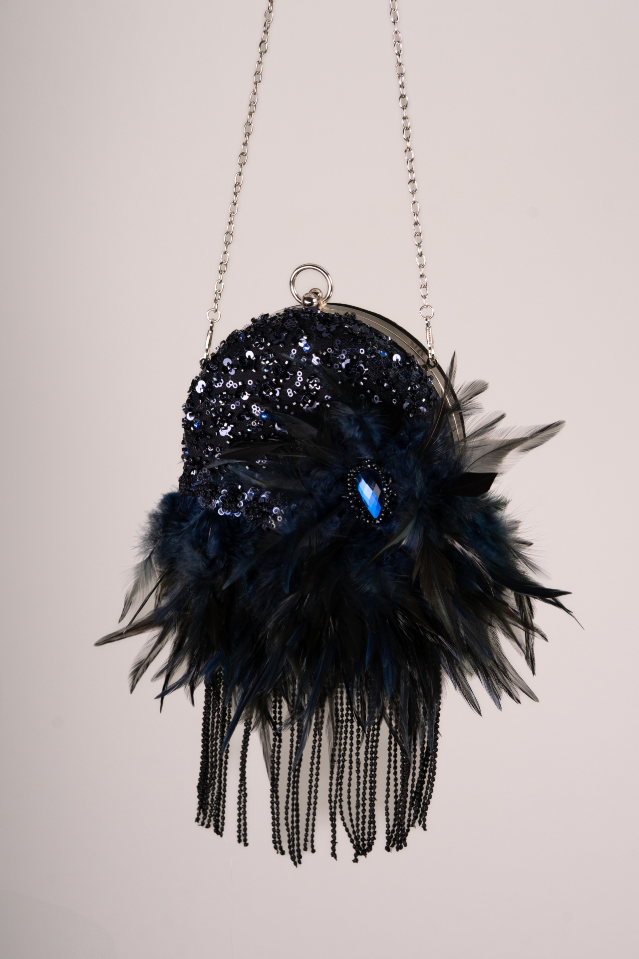 Bolso redondo negro forrado con pedrería azul noche. Decoración de plumas de gallo azuladas y broche de piedra para dar brillo. El toque coqueto lo dan unos flecos que aportan movimiento. Med. 16cm. X30cm. X5cm. Aprox.