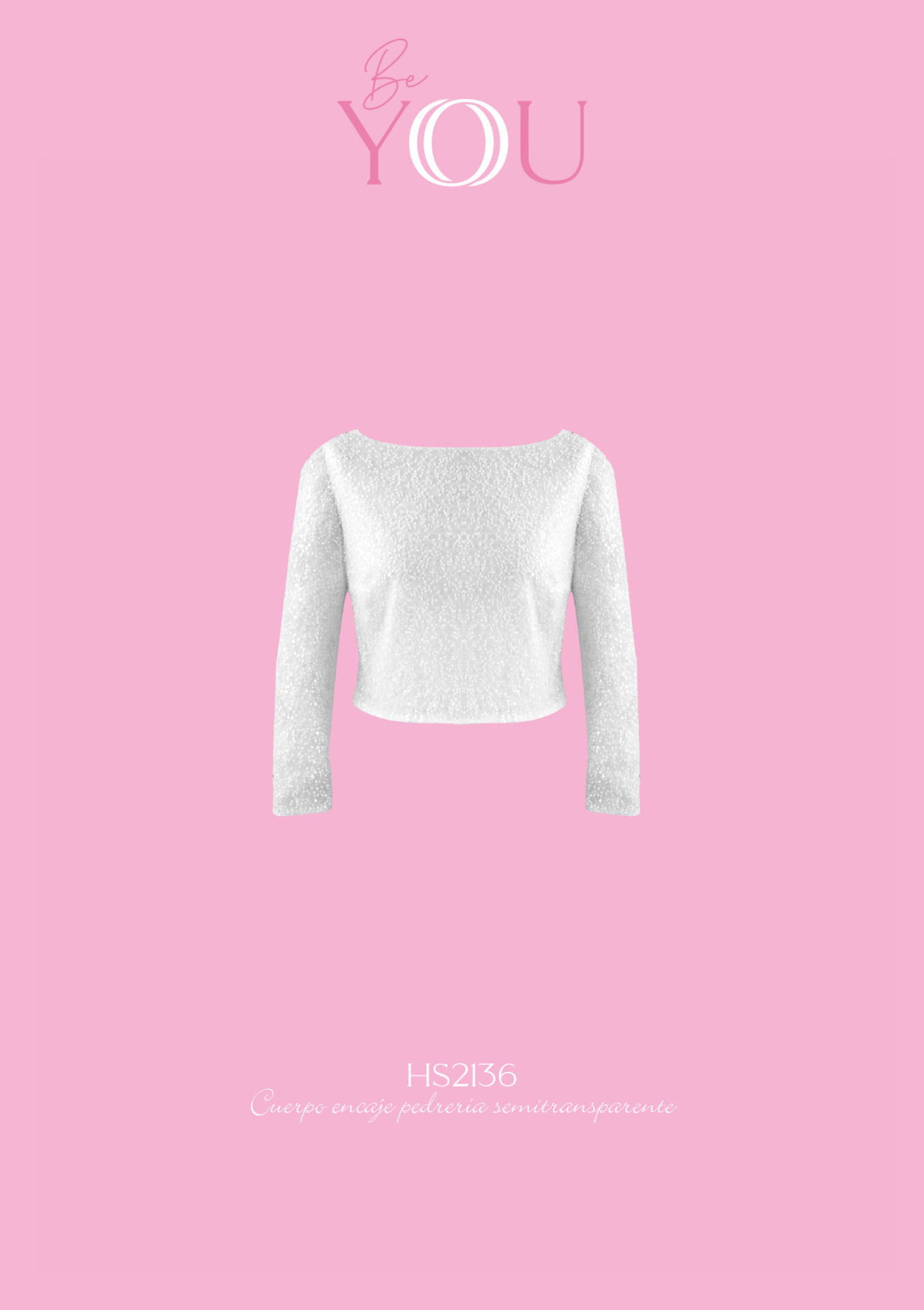 Espectacular crop top de novia confeccionado en encaje de pedrería, con escote barco y manga tres cuartos.