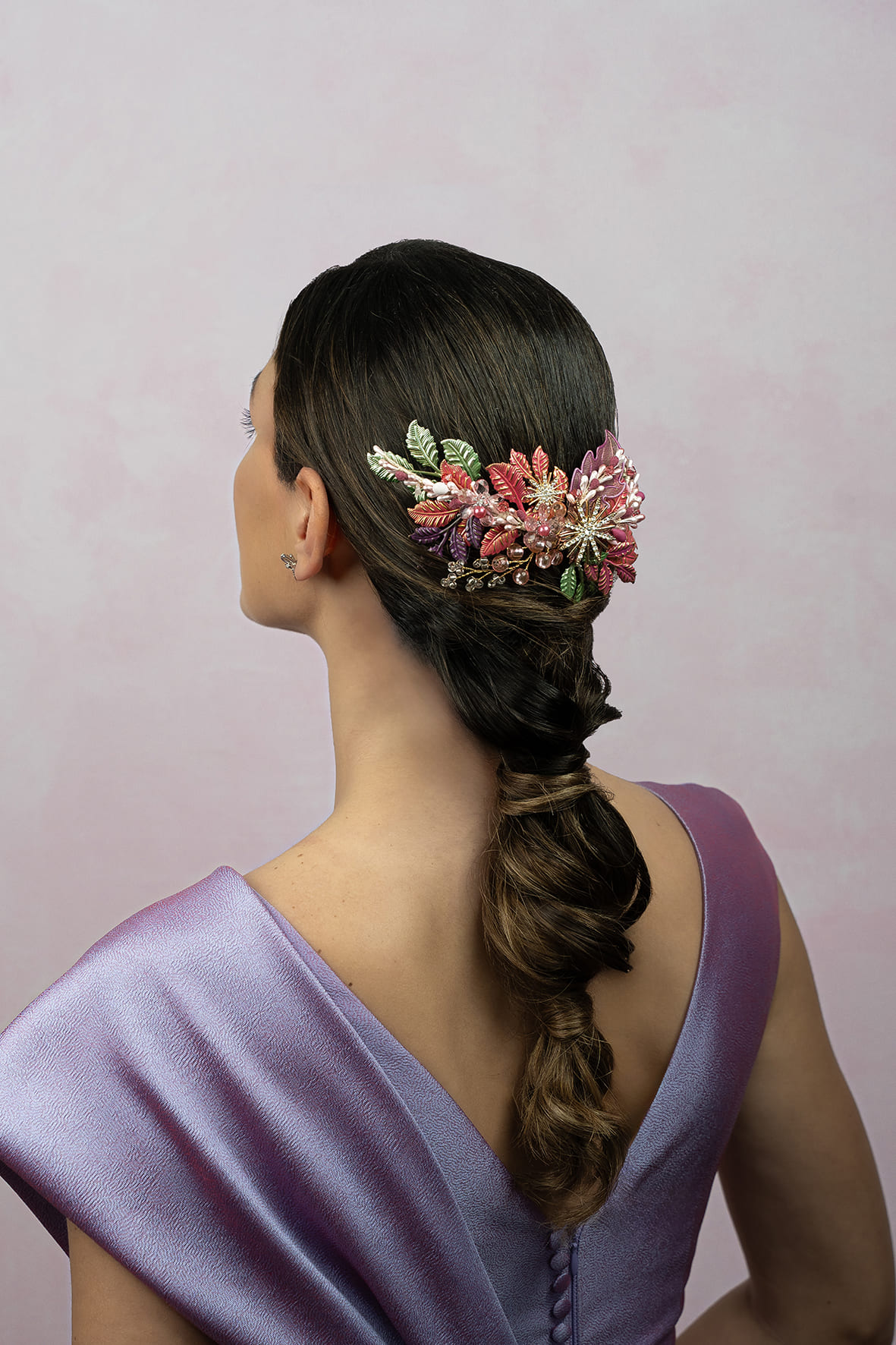 Tocado joya de metal dorado y teñido en colores. Se compone de pistilos de piedras y cristales en varios tonos de rosas, morados y verdes. Lleva unas estrellas centrales doradas y con cristales brillantes. Tiene una peina dorada para facilitar su colocación .Mide 20cm aprox.