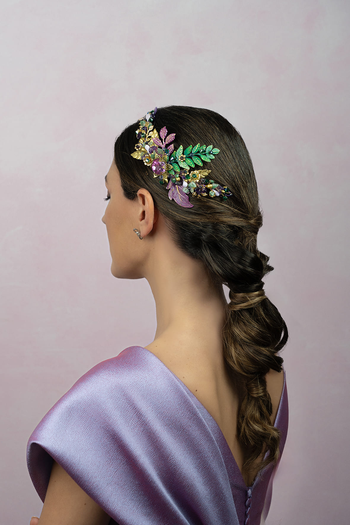Tocado joya de metal dorado con algunas de sus piezas teñidas de colores, con brillos, piedras, pistilos en tonos verdes y morados. En el centro lleva una filigrana dorada con una piedra preciosa morada engarzada. Lleva peina central y en sus extremos presillas. Va todo envuelto con hilo de seda. Mide 20cm aprox.