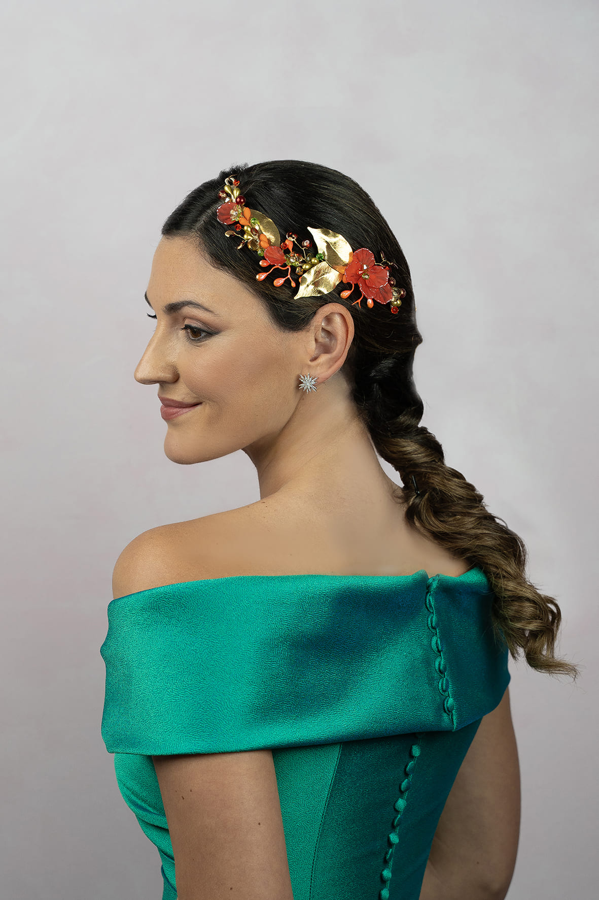 Tocado joya con hojas metálicas doradas, pistilos, piedras y cristales en tonos naranja, dorados burdeos y un toque en verde lima. Lleva presillas en los extremos .Mide 21cm aprox.