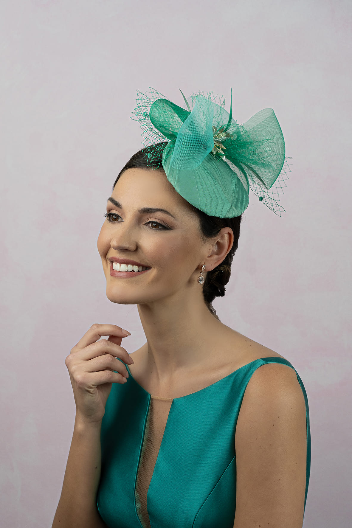 Tocado casquete base de 14 cm, forrada en tejido brocado verde turquesa con crin y velo.