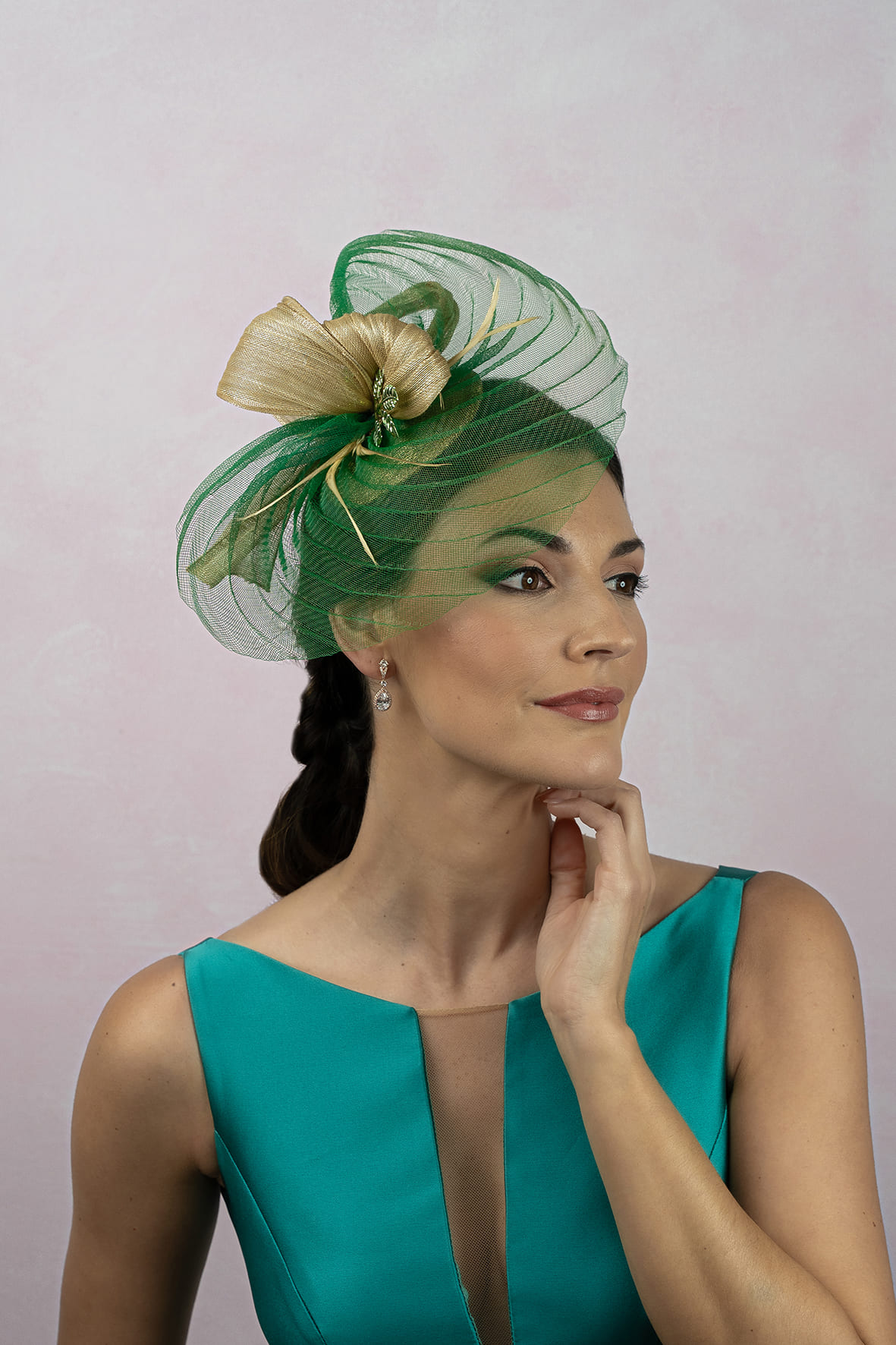 Tocado media ala de crin diagonal en verde y dorado.