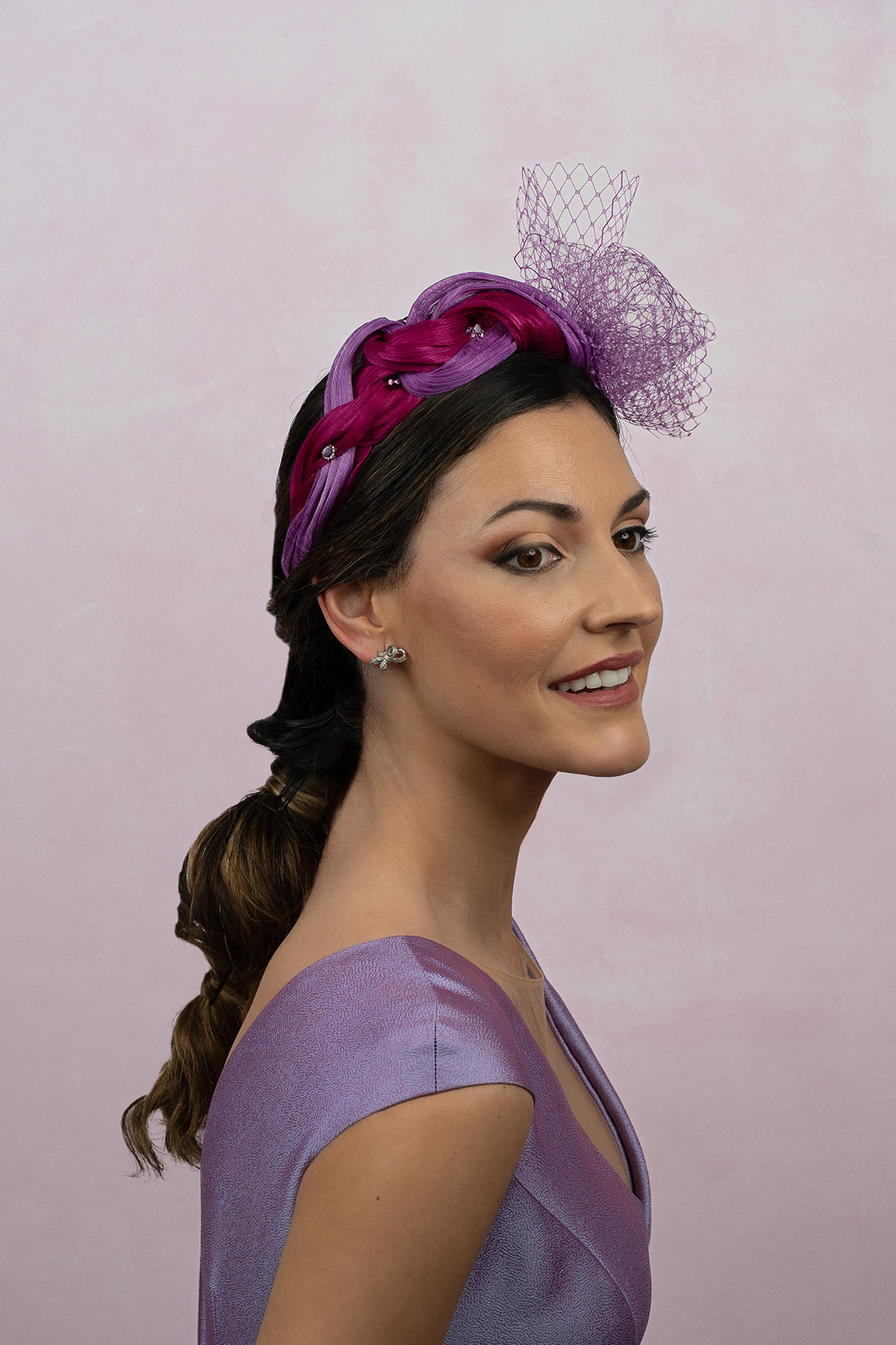 Diadema forrada en sinamay y abaca de seda entrelazadas entre sí, en tonos buganvilla y morado. Lleva un adorno de piedras y piezas metálicas en tonos morados, y en un lado una lazada de velo dando un toque atrevido.