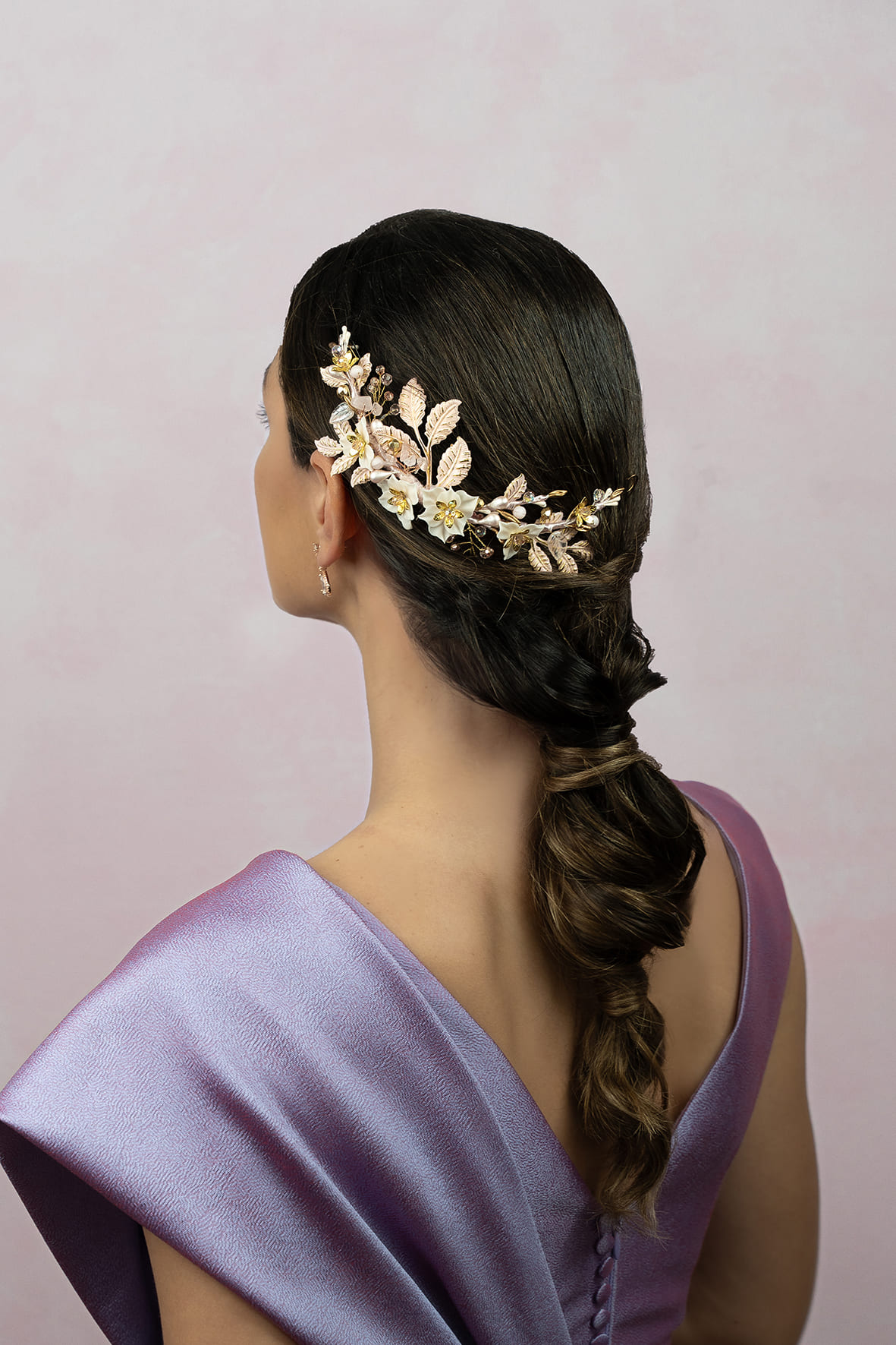 Tocado joya con flores de porcelana y hojas metálicas teñidas en tonos rosa nude.