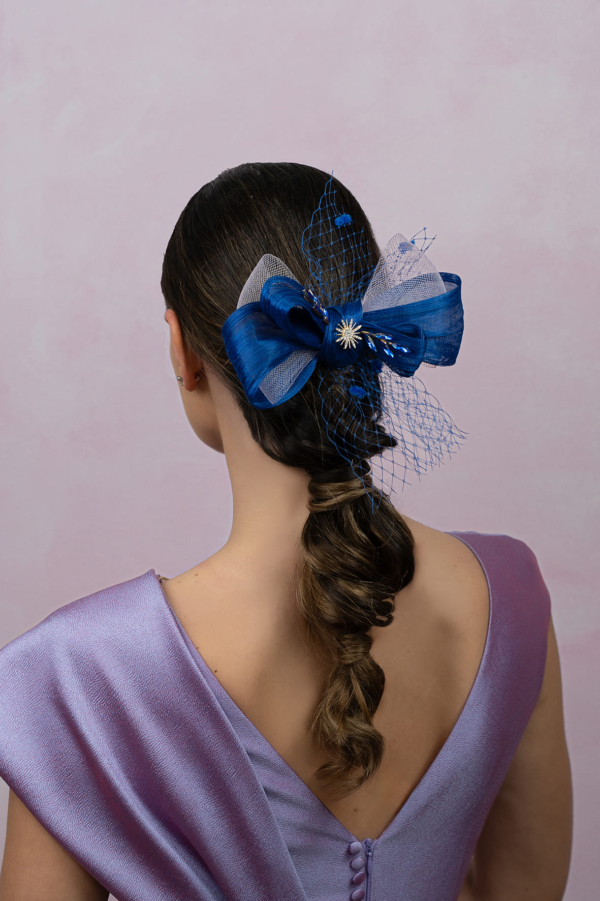 Lazada de sinamay abaca de seda en azulina. Lleva por dentro lazada de crin y un poco de velo adornando y en el centro lleva una estrella de brillos dorada y dos ramas de cristales azules. Para colocarla lleva una peina y mide 20cm. aprox.