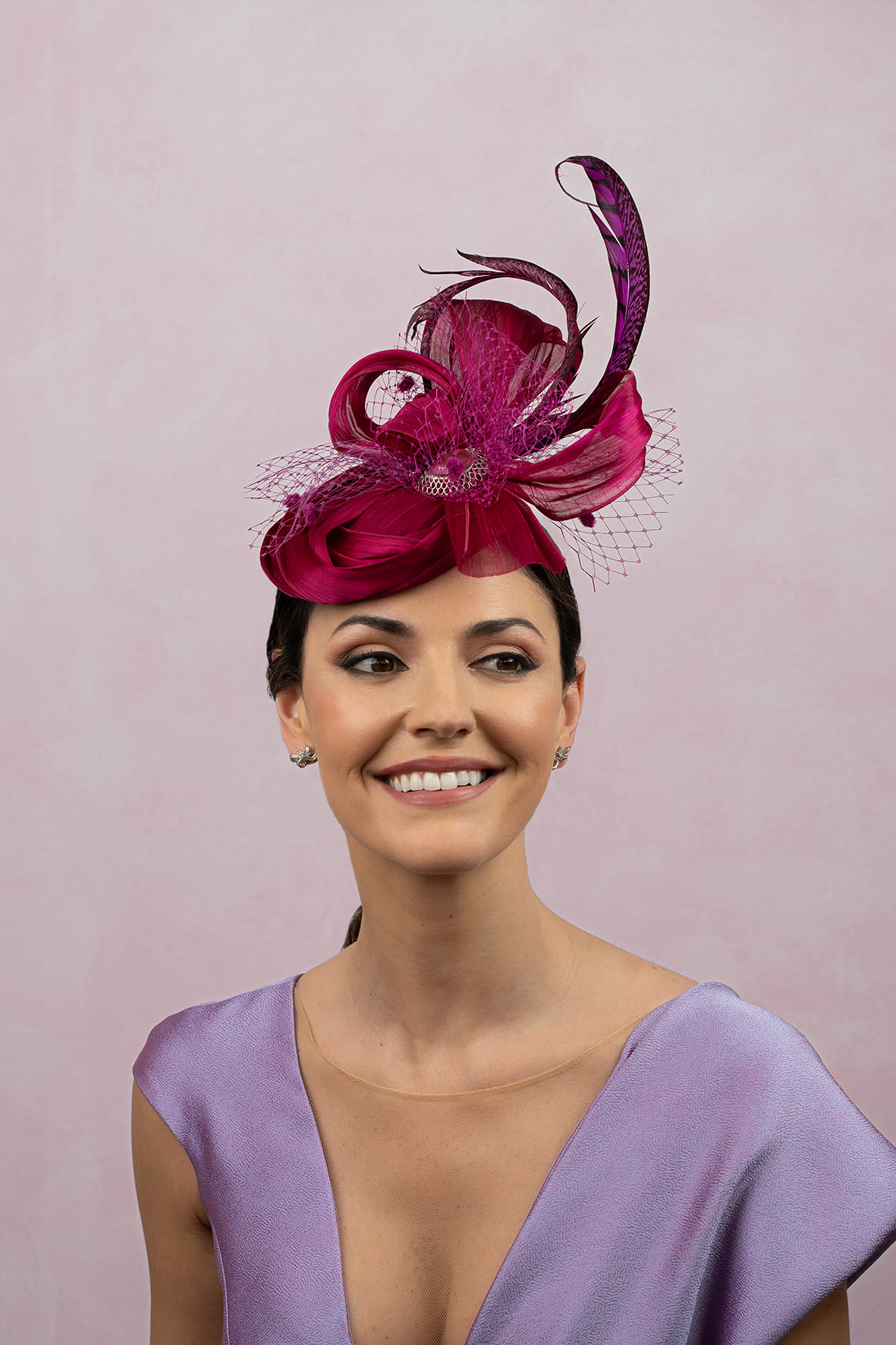 Tocado de sinamay abaca en seda en buganvilla. La base va forrada del sinamay, y encima lleva unas lazadas adornadas con velo y dos plumas de faisán. Se adorna con un broche central dorado envejecido y piedra al tono del sinamay. Lleva diadema y mide 30*21 cm aprox.