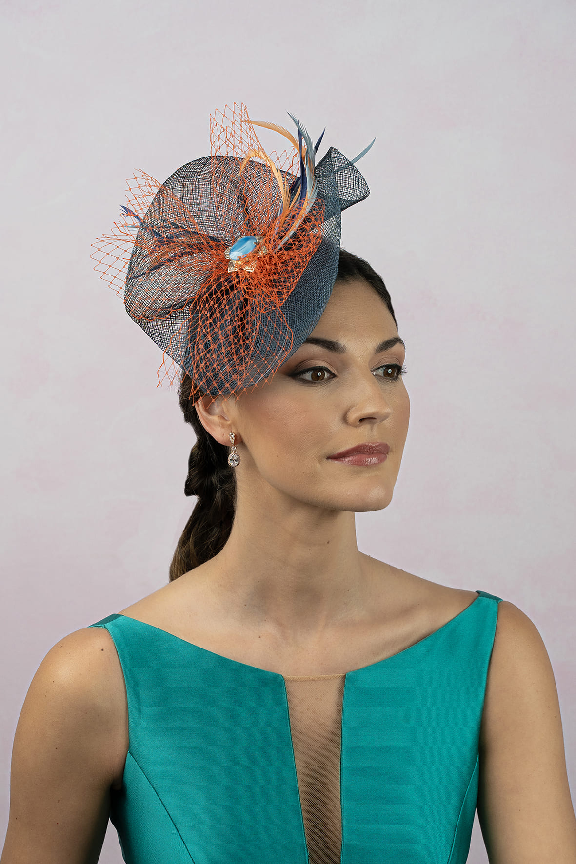 Tocado ala de 25cm marino con red naranja y plumas bio, adornando con filigrana pateada con piedra azulona. Todo montado sobre una base con una peina para su mejor colocación. Mide 24*18 cm aprox.