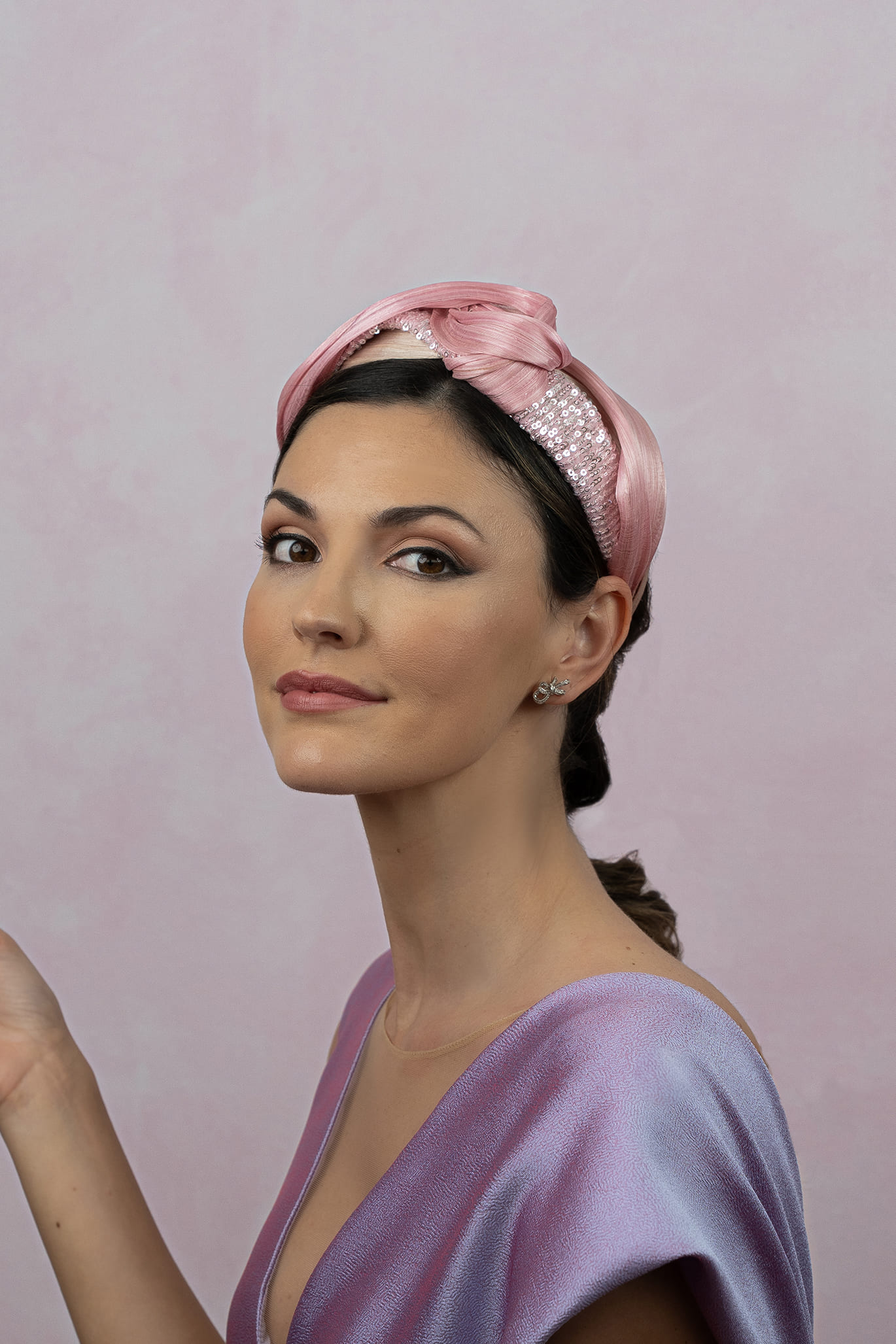 Diadema rosa de sinamay y encaje de lentejuelas. Combina dos tonos de sinamay abaca seda con una tira de encaje de lentejuelas entrelazadas entre ellas.