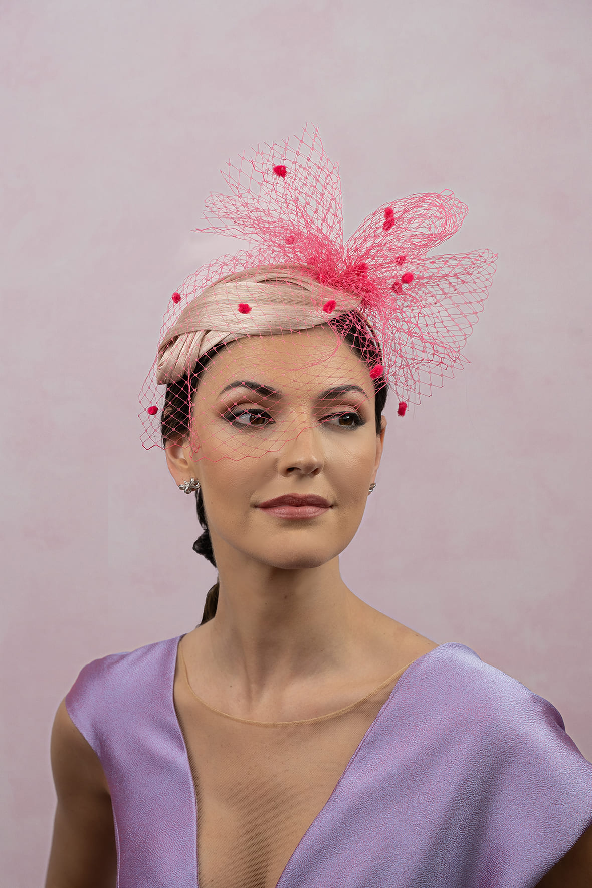 Diadema lágrima forrada de sinamay rosa nude y velo fucsia. Formado por una base en forma de lágrima forrada de sinamay abaca seda, complementada con un velo en tono fucsia que adorna y envuelve el rostro. La base mide 28*15 cm aprox.