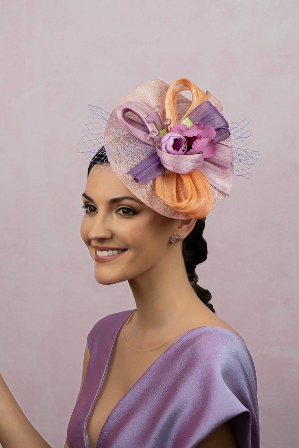 Tocado Ala de 25cm en nude con lazadas naranja, malva y morado. El ala, moldeada con forma circular, lleva lazadas de sinamay seda en tonos naranja y malvas, con velo y dos flores centrales. Lleva peina y mide 23*20cm aprox.