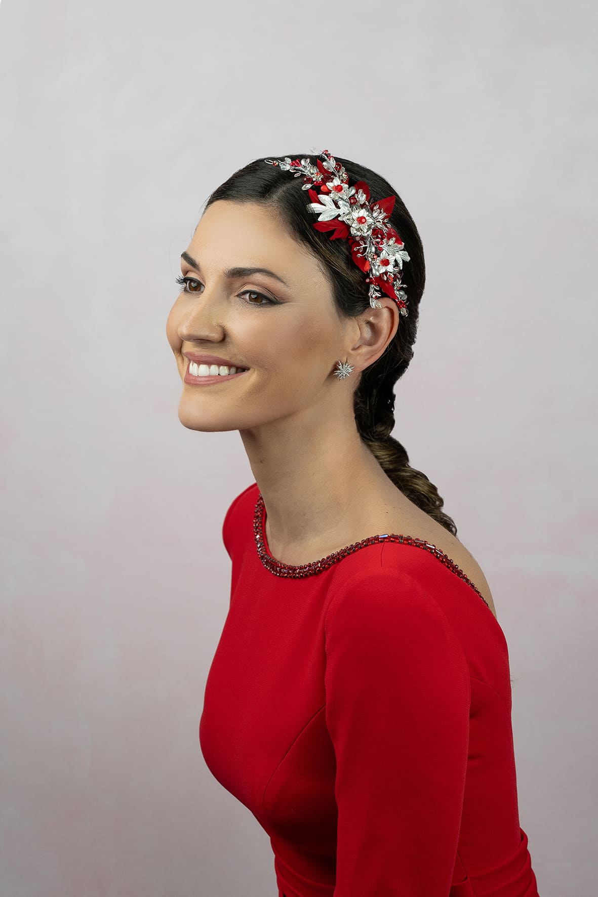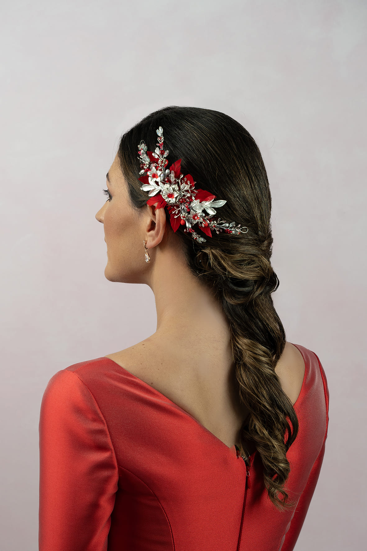 Tocado joya de metal plata con brillos, pistilos, aplicaciones de cristal y rodeado de hojitas de plumas anade rojas. Todo en tonos plateados y rojos con peina centra y trabillas en los extremos. Mide 18cm aprox.