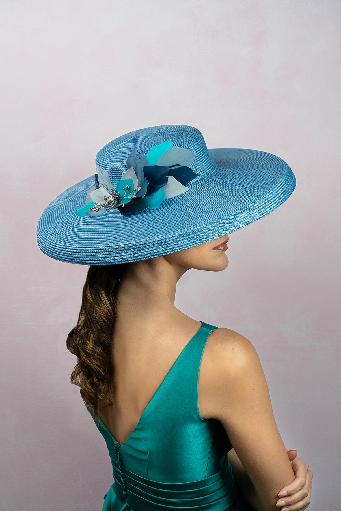 Pamela azul con adorno de plumas anade, lleva a un adorno de plumas anade en una bonita combinación de tonos marino, grises, turquesa y azules, con una aplicación metalizada plata. Mide 46cm de diámetro.