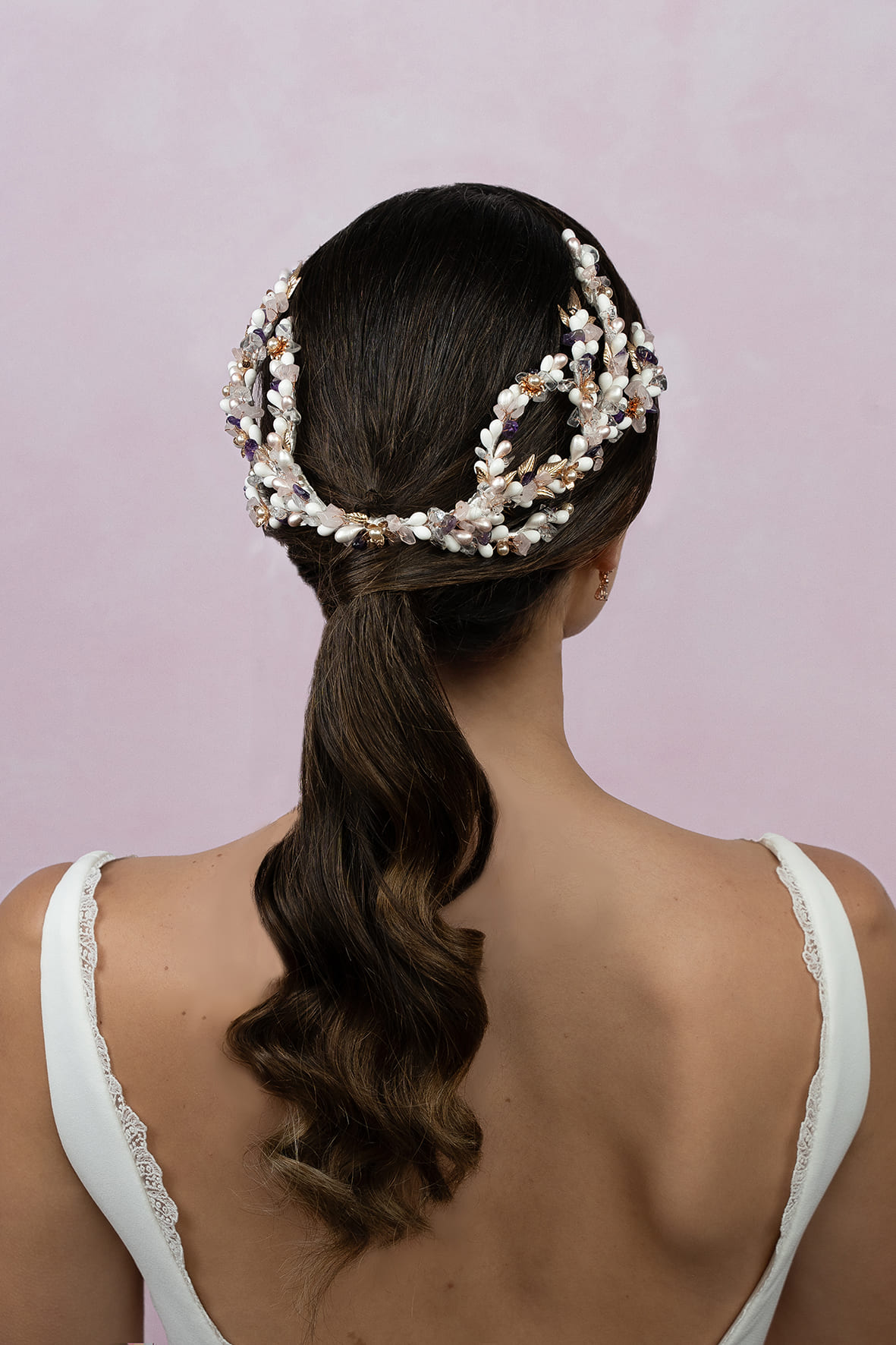 Semi-Corona de pistilos y piedras en tonos marfil, rosa nude y un toque de morado, con piezas pequeñas de metal en oro rosado. Lleva una peina central y presillas en sus extremos. Mide 47 cm aprox.