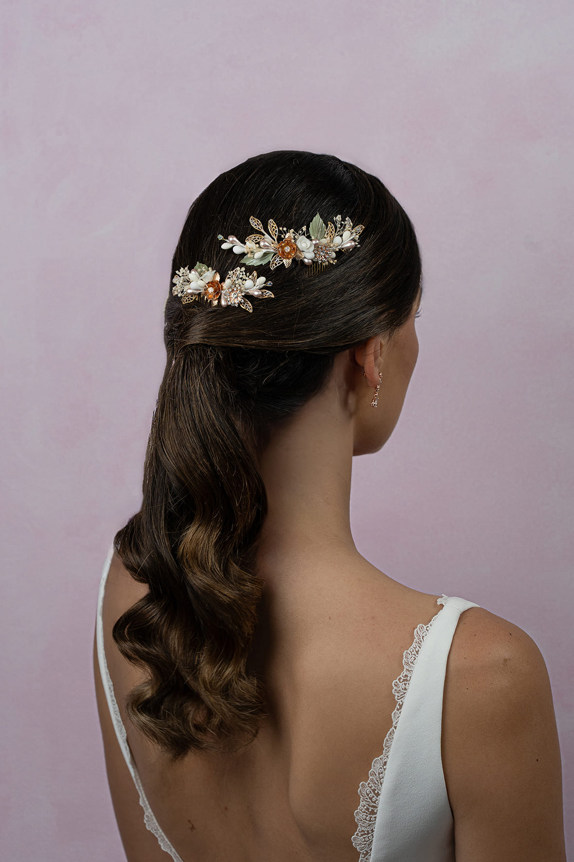 Dúo de peinas de pistilos con hojas de porcelana y toque de paniculata. Lleva flores y hojas metálicas con unas minis estrellas de brillos. Miden 12 y 10 cm aprox.