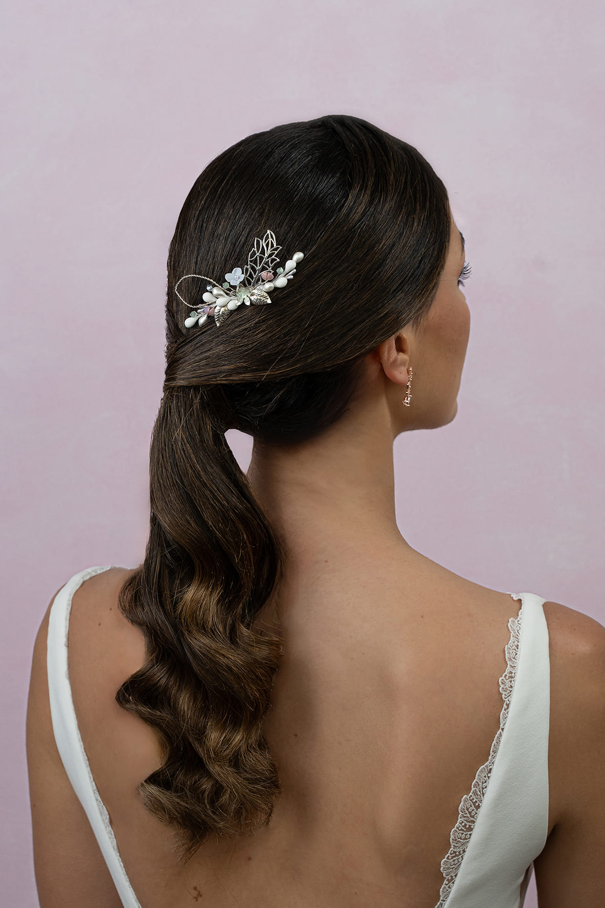 Peina de pistilos, metal y porcelana, una pequeña pieza formada de pistilos blancos, hojas metálicas plateados, dos florecillas, una de porcelana y otra metálica. Lleva algunas piedrecitas malva y brillos verdes.