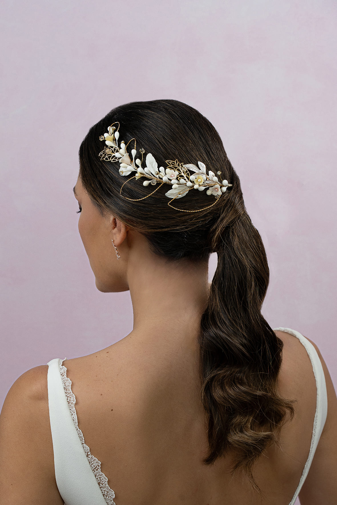 Tocado joya, forma de rama, compuesto de pistilos mates y con brillo, flores y hojas de porcelana, hojas metálicas doradas, cristales y brillos, todo envuelto en hilo de seda dorado. Mide 18cm aprox.