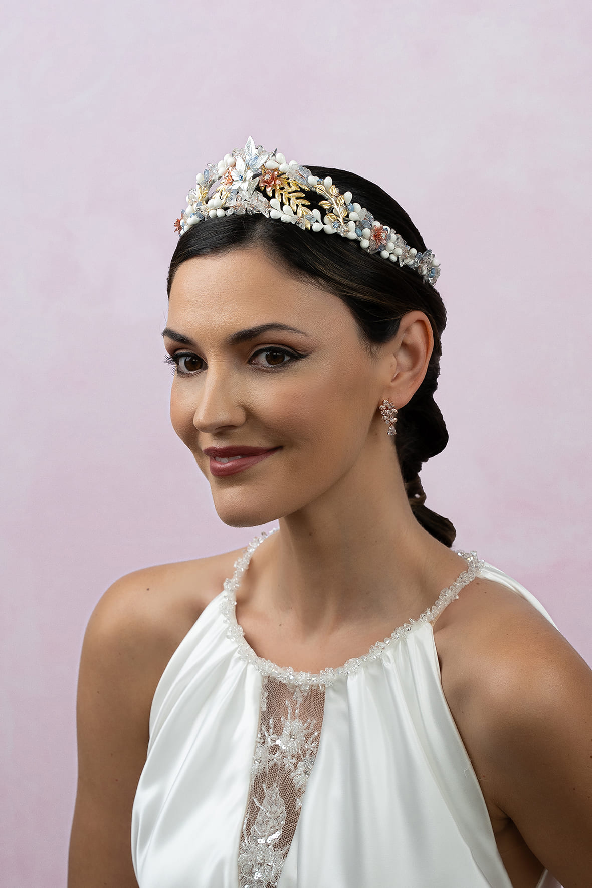 Tiara de pistilos, metal y cristales azules. Esta pieza consta de dos tiras, cada una formada de pistilos blancos con brillos, piedras, cristales, y piezas metálicas de varios colores. La tira de arriba, con forma imperial, en el centro lleva una rama y flor central, toda engarzada en hilo de seda blanco y con dos peina en los extremos para su colocación. Mide 40 cm aprox.