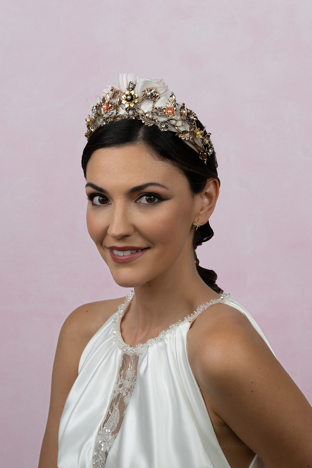 Tiara de metal dorada envuelta en plumas nude. Esta pieza lleva diferentes clases de florecillas metálicas, unas con brillos y otras con perlitas en los centros. Lleva trabillas en ambos extremos. Mide 34cm aprox.