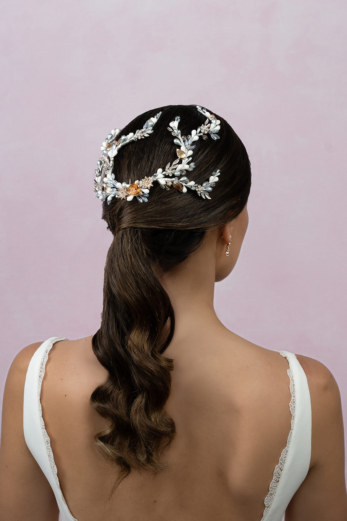 Semi tocado de ramas de pistilos blancos y celestes, sus ramas desiguales llevan también hojitas metálicas de oro rosado, florecillas metálicas con brillos y bolitas de cristal rosa. Al tener esta forma asimétrica se puede colocar de muchas formas distintas. Mide 19*14 cm aprox.