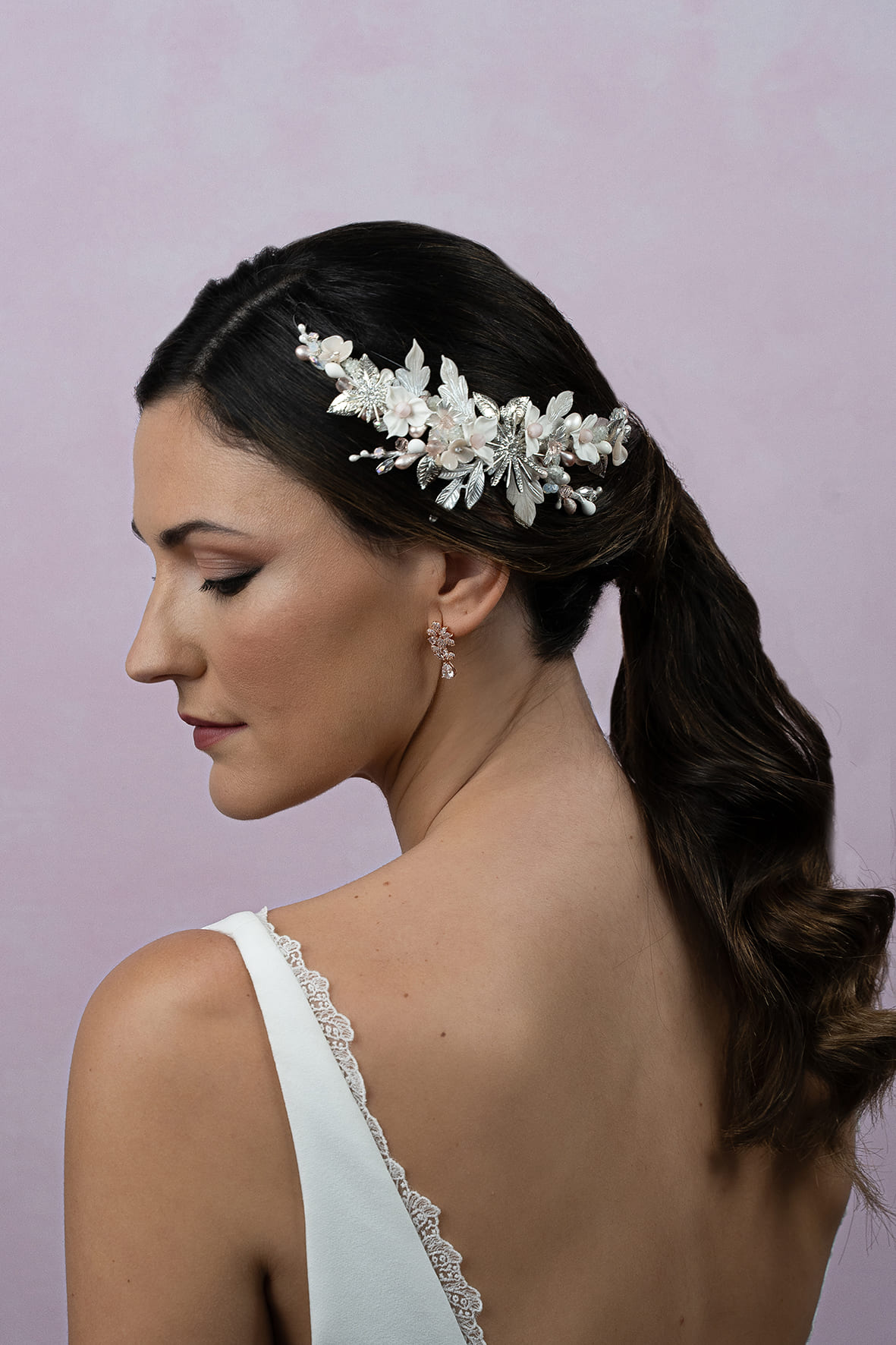 Tocado de porcelana y metal con estrella plateada central. Compuesto de pistilos, mate y nacarados, y con flores y hojas de porcelana hechas a mano. Lleva hojas y flores metálicas en plata, y cristalitos y brillos en tonos blancos y rosa, dando luz a esta pieza. Lo adornan dos estrellas, una central grande y otra más pequeña en un lado. Todo envuelto en hilo de seda y con dos presillas en los extremos. Mide 19*7 cm aprox.