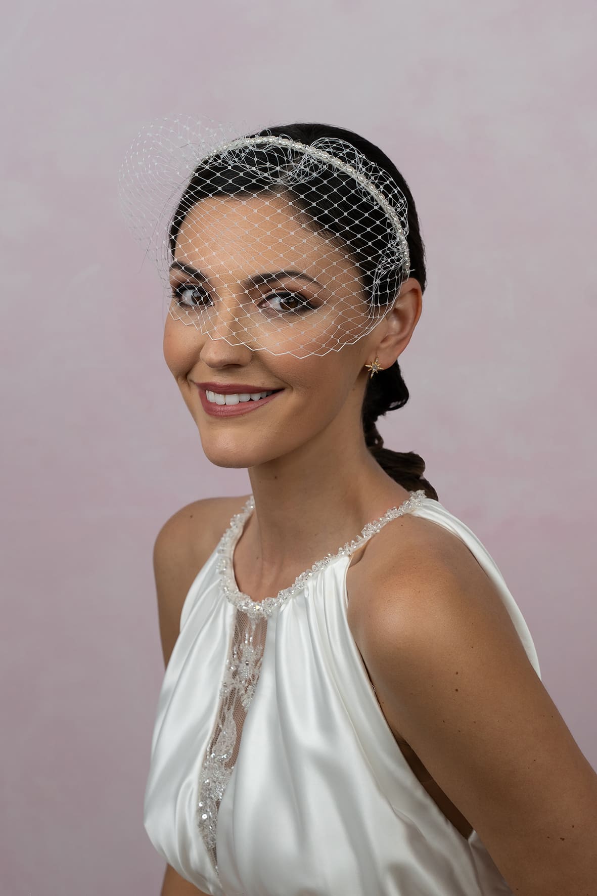 Diadema con velo y tira de brillos y perlas. Diadema fina de 0,5mm forrada de bies de raso todo alrededor. Lleva colocado un velo blanco y encima una tira de combinación de brillos y perlitas. Mide 40 cm aprox.