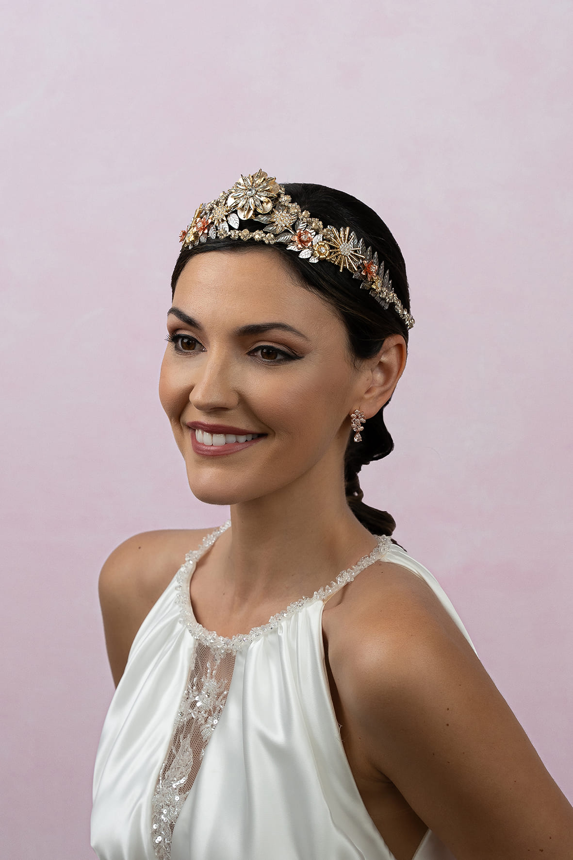 Tiara Imperial realizada toda en metal con brillos. Combinación de diferentes piezas metálicas, hojas, flores y tira de brillos en tonos de dorados y plata. Una estrella central le da importancia y luz al tocado, una pieza perfecta para lucir como una reina. Mide 40*6 cm aprox.