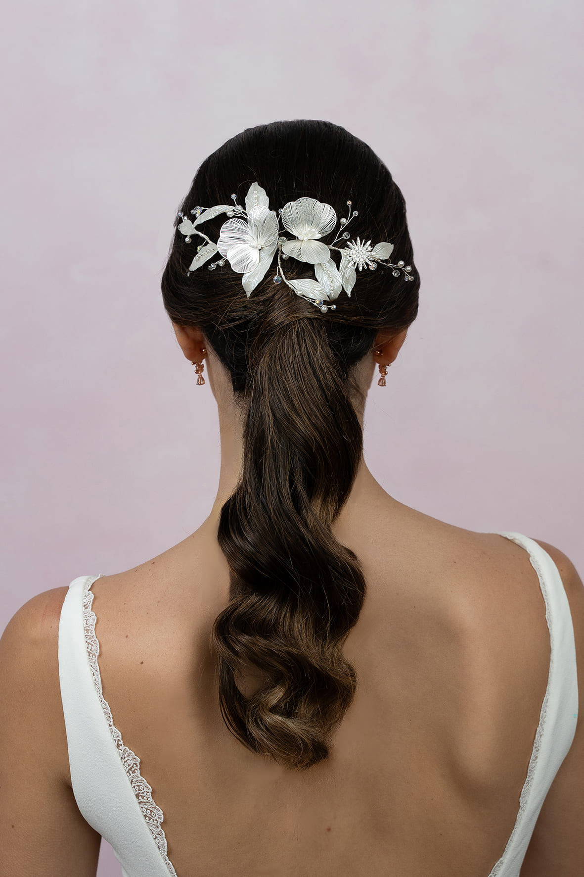 Tocado joya de flores de hilos metálicos con hojas de porcelana y brillos. Compuesto de unas ramas de hilo de alpaca en plata, liado a mano y que de ellas salen ramitas de cristales y perlitas acompañadas de unas preciosas hojas de porcelana nacaradas, con dos flores de hilo de metal y pistilos que dan importancia a la pieza. Mide 22*10 cm aprox.