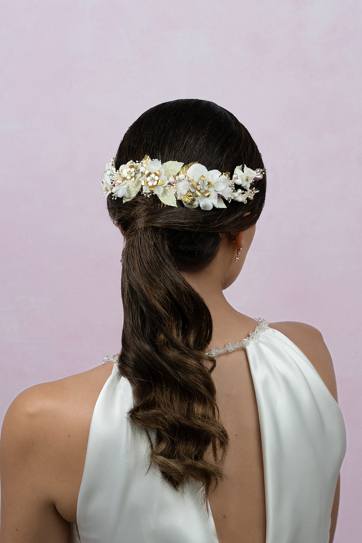 Tocado alargado de porcelana, metal dorado y flores de tela. A los lados lleva flores y hojas teñidas de verde clarito de porcelana artesanal y encima unas de metas con un brillo y por los lados acompañadas de piezas de metal doradas, manojitos de paniculata, pistilos de varias formas y colores que le da alegría. En el centro lleva peina. Mide 30*6 cm. Aprox.