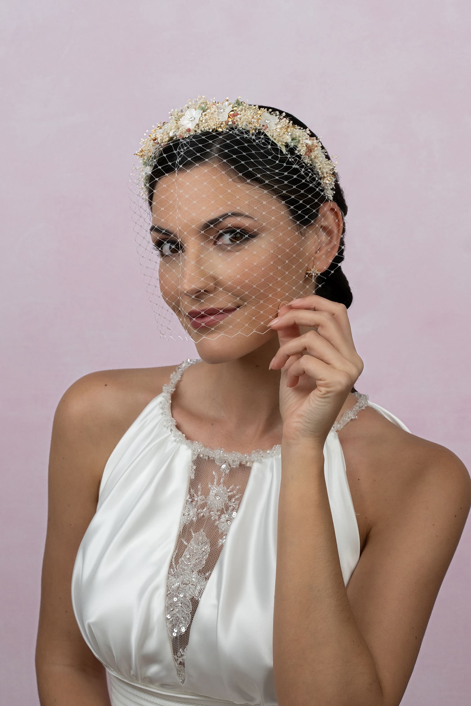 Semi corona silvestre de flores preservada con velo, hojas de porcelana y ramitas de metal dorado compuesto de migui, pistilos, brillos, cristales y unas sencillas flores de porcelana, que no le restan el aspecto natural de su esencia. Con presillas en los extremos. Mide 40cm aprox.