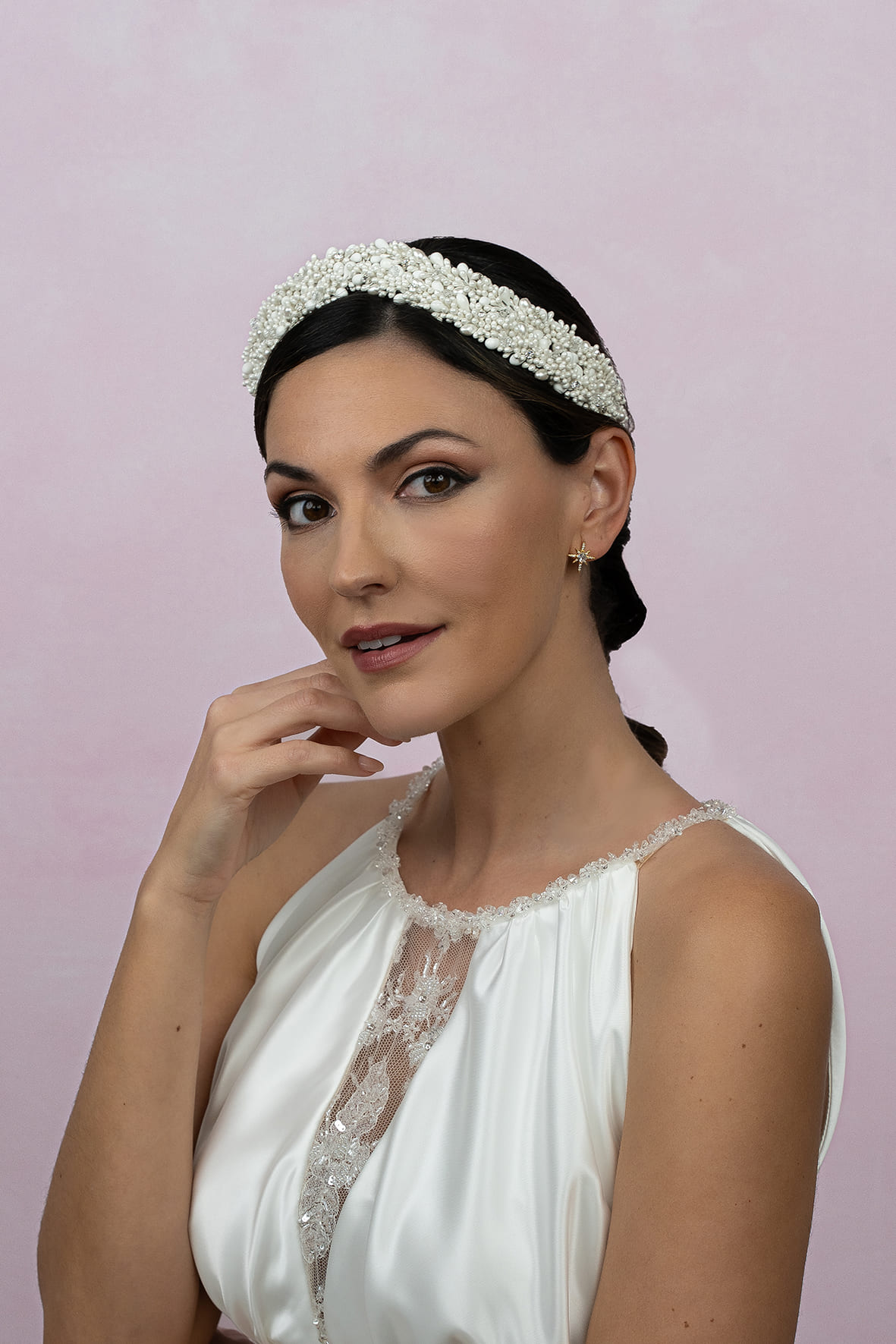 Tiara de pistilitos nacarados, mates y brillos con chatones plata y cristales. Compuesta de dos tiras de pistilos, la mayoría pequeños nacarados y en menor cantidad de mate y de brillo de 5mm. Combinados todos en perfecta armonía y con un toque de cristales y chatones plateados, que le dan luz a esta pieza. Toda envuelta en hilo de seda blanco. Lleva ojales metálicos en los extremos. Mide 42*4 cm aprox.