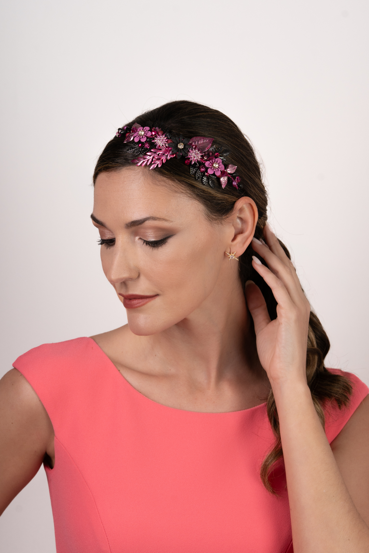 Diadema/alamar joya en metal buganvilla y negro. Compuesto de diferntes hojas,flores y estrellas de metal pintadas a mano,con un toque de brillos y lentejuelas. Med. 21cm. Aprox.