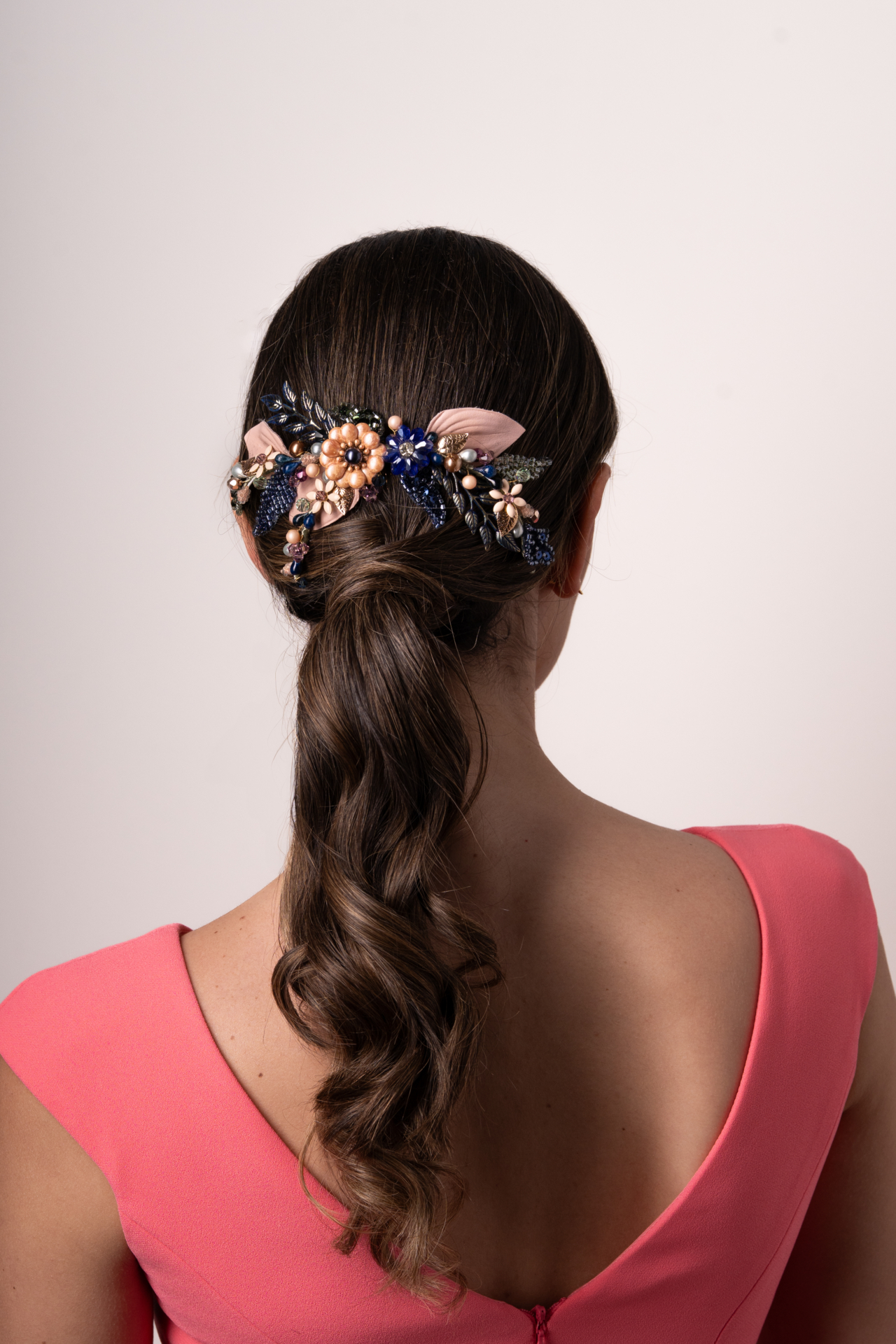 Tocado tipo joya joya en tonos nude,verdes y azulados. Compuesto por hojas de piel y metal,flores esmaltadas,acompañadas por pistilos y brillos enriquecido con hojas de encaje. Med. 21cm. Aprox.