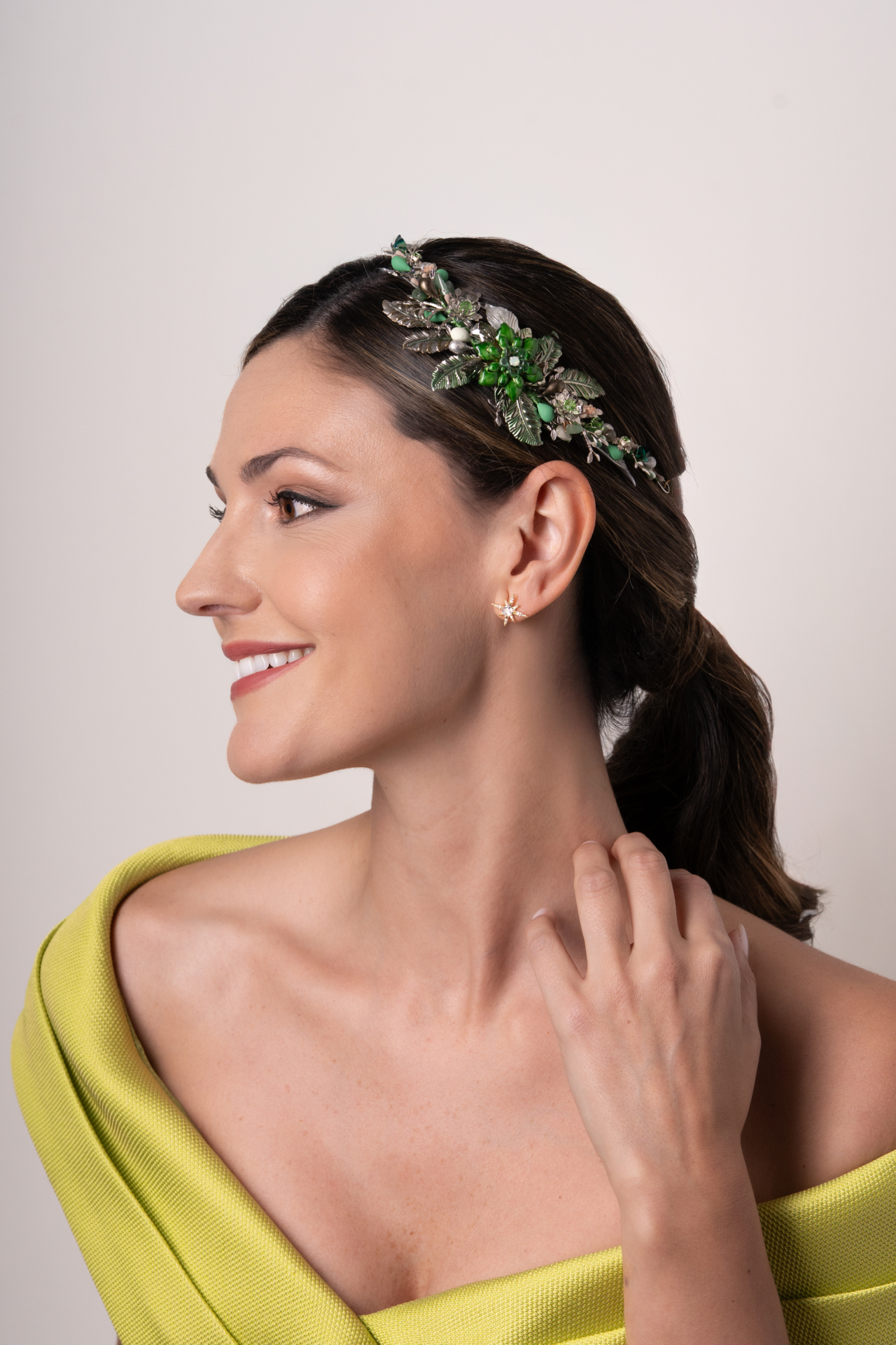 Tocado tipo joya joya en su mayoría de metal plateado y tono verde hierba. Metal teñido y envejecido dan un toque vintage, enriquecido con pistilos, brillos y hojas de porcelana hechas a mano. Flor central esmaltada. Med. 20cm. Aprox.