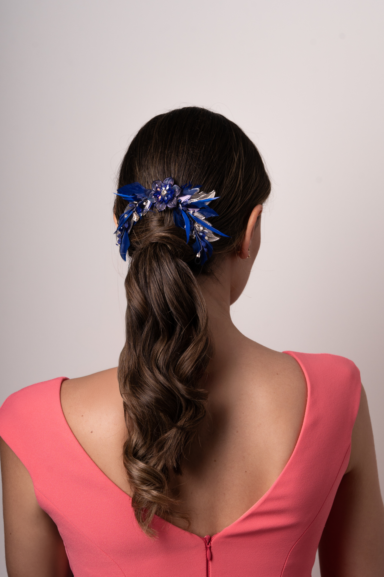 Tocado tipo joya coletero,medialuna en tonos azulina y plata. Las plumas son las protagonistas de esta creación,acompañadas de piezas de metal,pistilos y brillos. Flor central de cristales dan un toque de luz a la pieza. Med. 20cm. Aprox.
