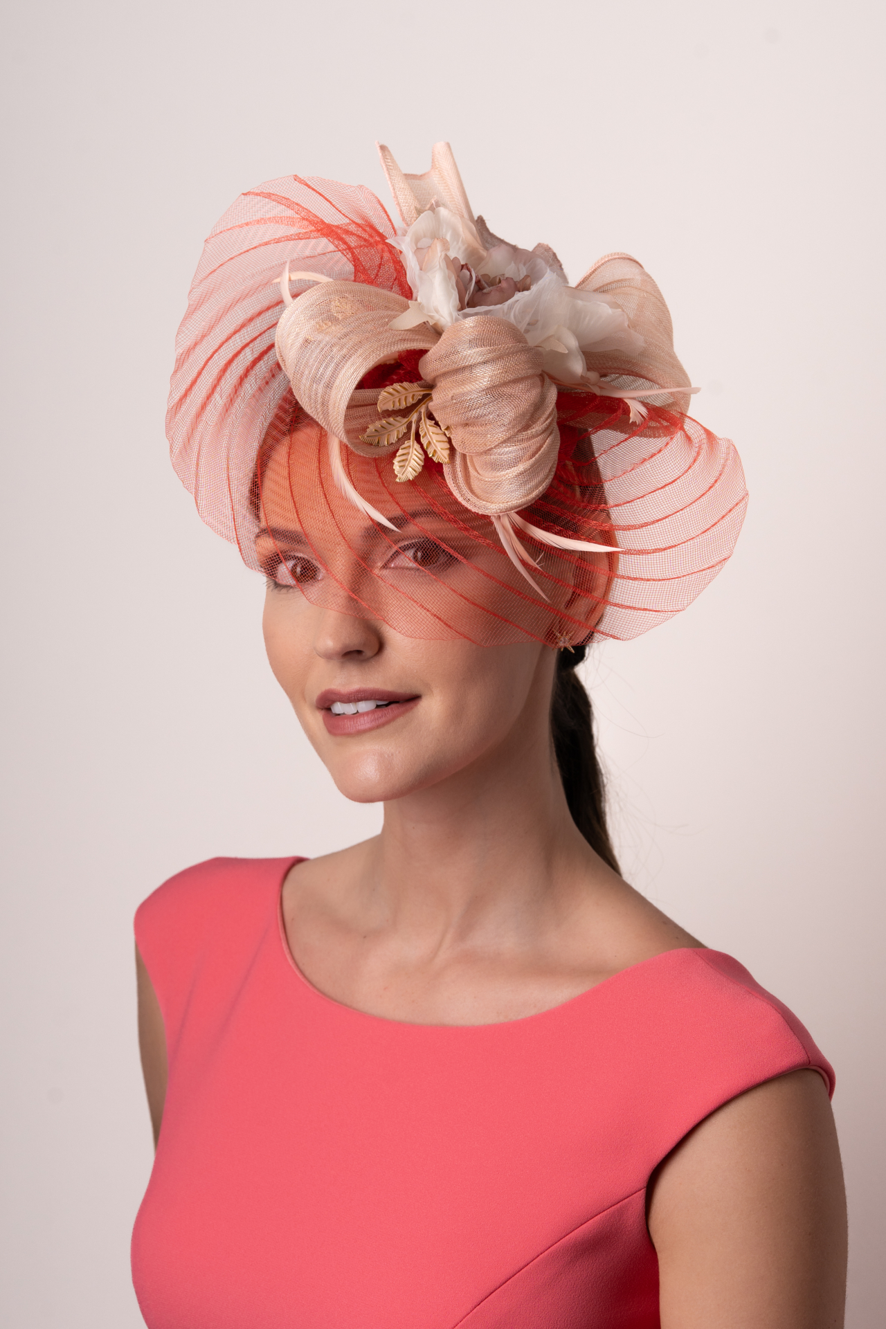 Ala de crin hexagonal en tono rojizo, adornada con sinamay rosa nude y una gran flor al tono con petalos delicados. Para complementar unas plumas biot y hojitas de metal pintado. Para la colocación una diadema forrada. Med. 32cm. X25cm. Aprox.