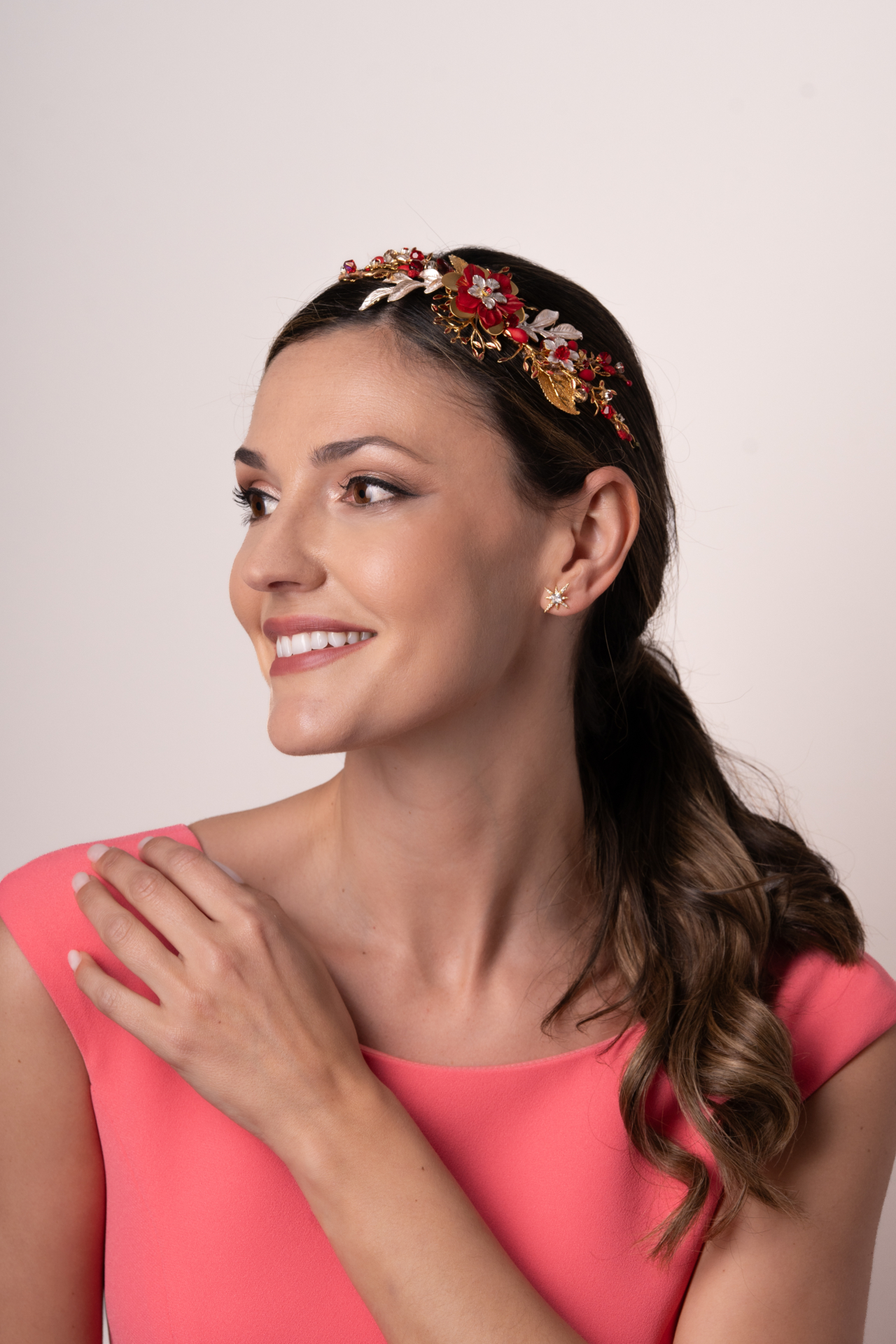 Tocado tipo joya joya en tono rojo y combinado con metal dorado y metal nacarado. Diseño de ramitas conconvinacion de flor central en porcelana hecha a mano y metal. Enriquecido el tocado con pistilos, bolas y brillos rojos. Med. 19cm. Aprox.