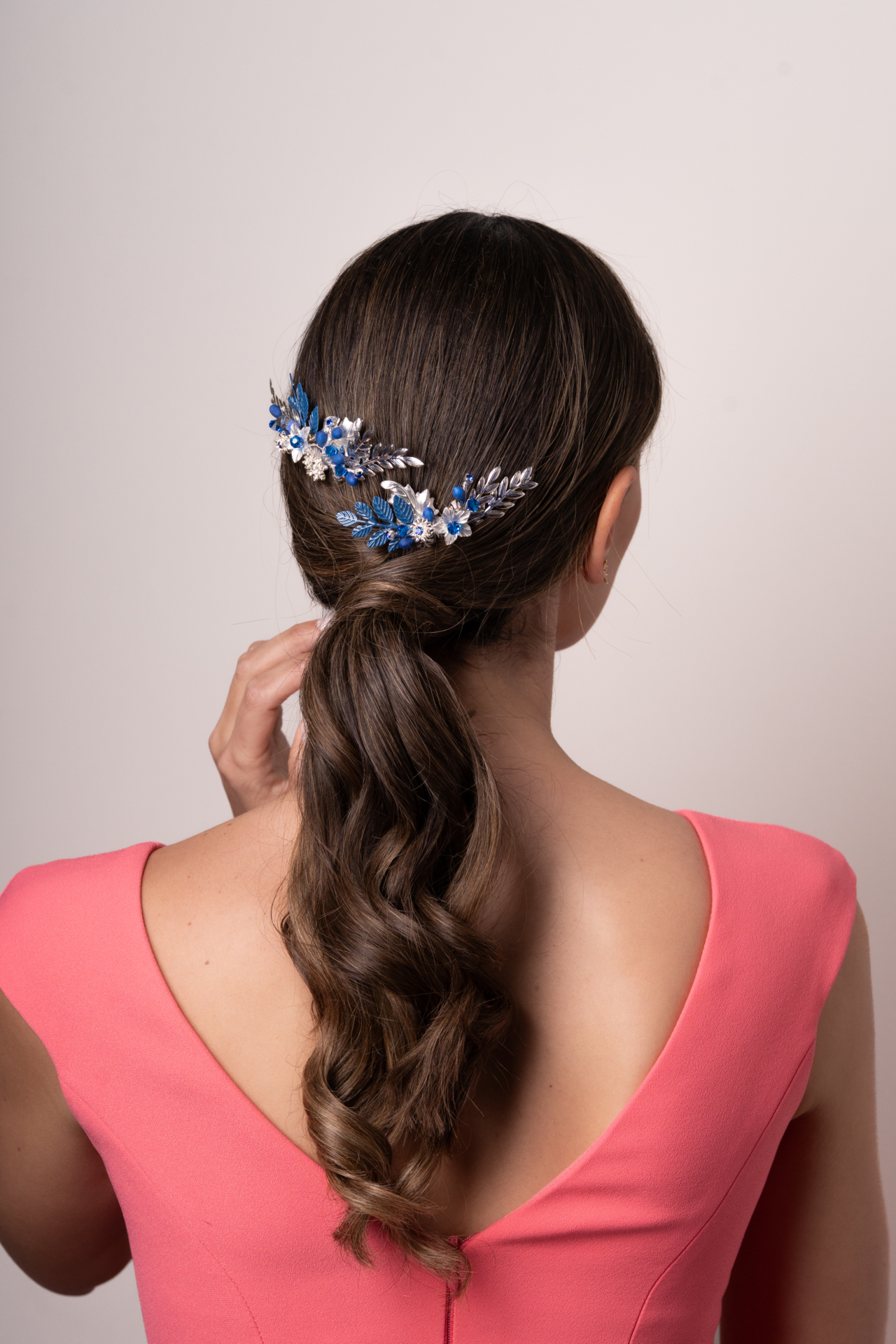 Juego de peinas en metal plata y azulina. Cada peina tiene un diseño diferente y un tamaño. Esta combinación lleva pistilos, bolas y brillos para culminar el diseño. Med. 13cm. Y 10cm. Aprox.