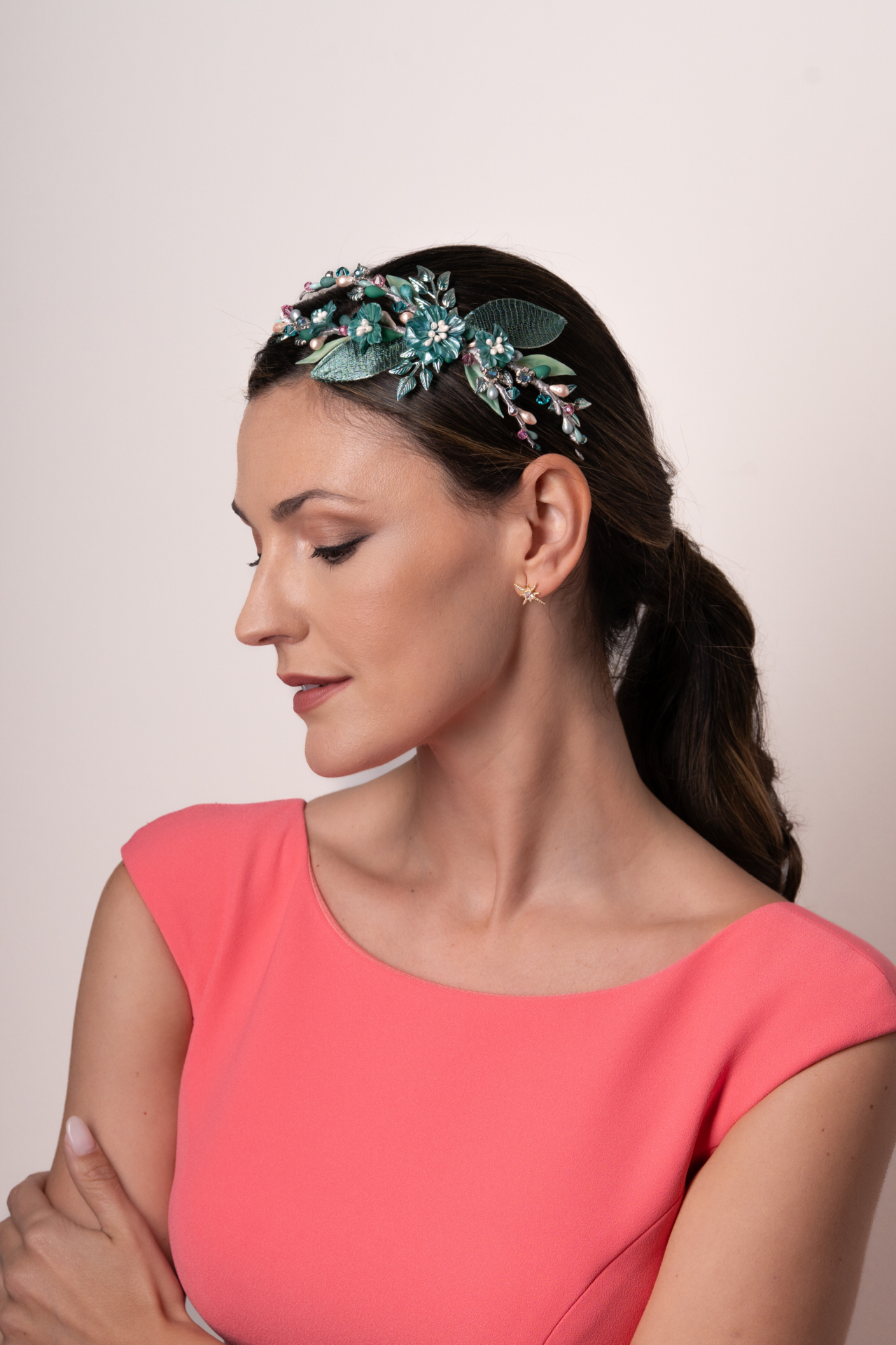 Tocado tipo joya joya en tonos turquesa y toque de rosa. Compuesto por cuatro flores de porcelana hechas a mano, acompañadas de pistilos, brillos y bolitas. Unas hojas de metal, maya y porcelana realzan el diseño. Med. 22cm. Aprox.