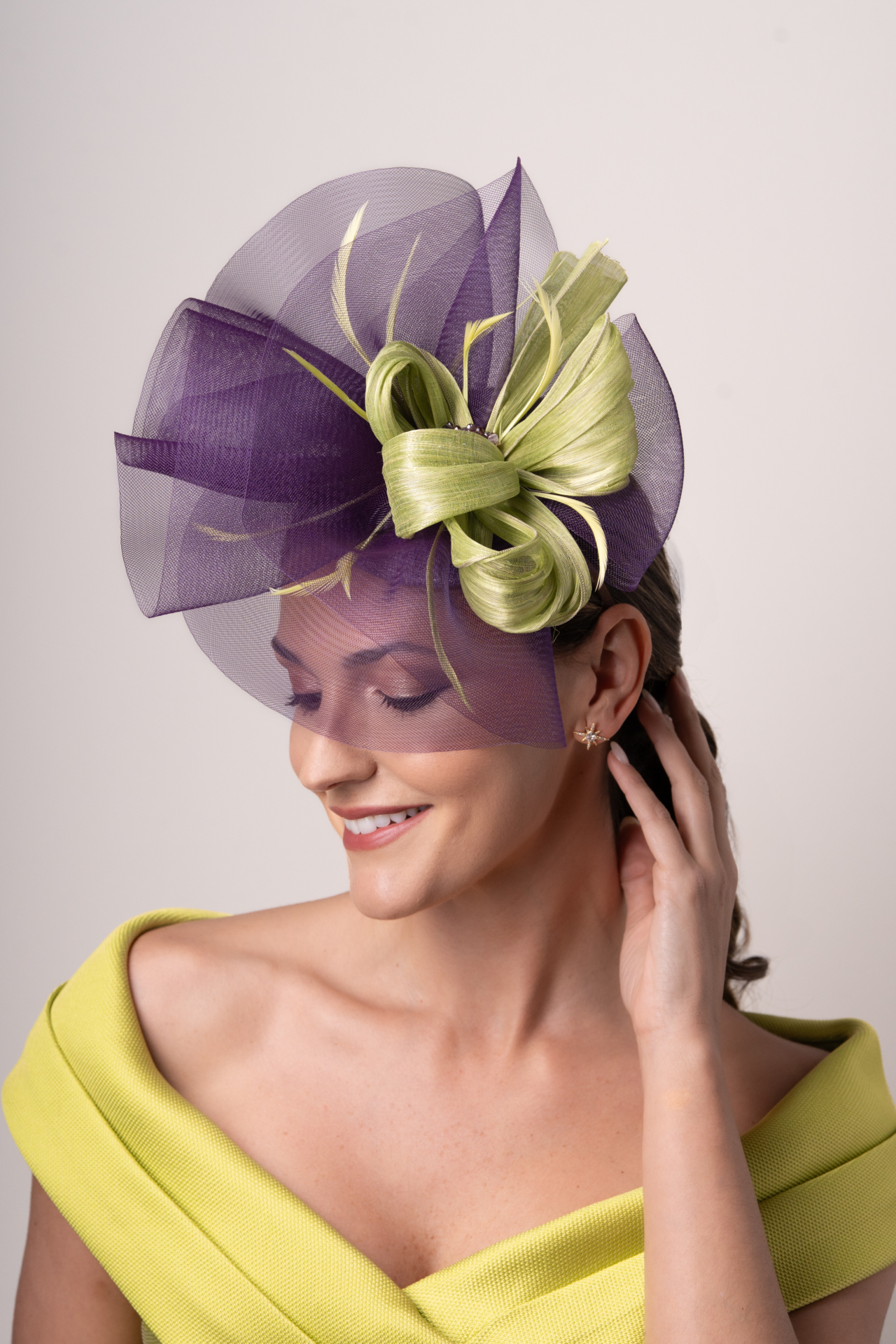 Tocado tipo joya con base y crin morado con formas voluminosas, que combinan a la perfección con una lazada de sinamay en verde lima y plumas biot. Como pieza central un broche de piedras al tono. Med. 25cm. X29cm. Aprox.