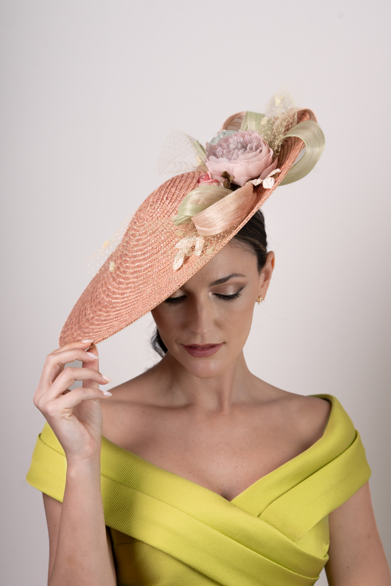 Pamela de paja en tono rosa vintage con decoración floral en tonos pasteles verdes y rosas. Combinado con unas lazadas de sinamay en los tonos y una red de topitos conforman un diseño muy dulce. Para la sujección una diadema forrada. Med. 45cm. Aprox.