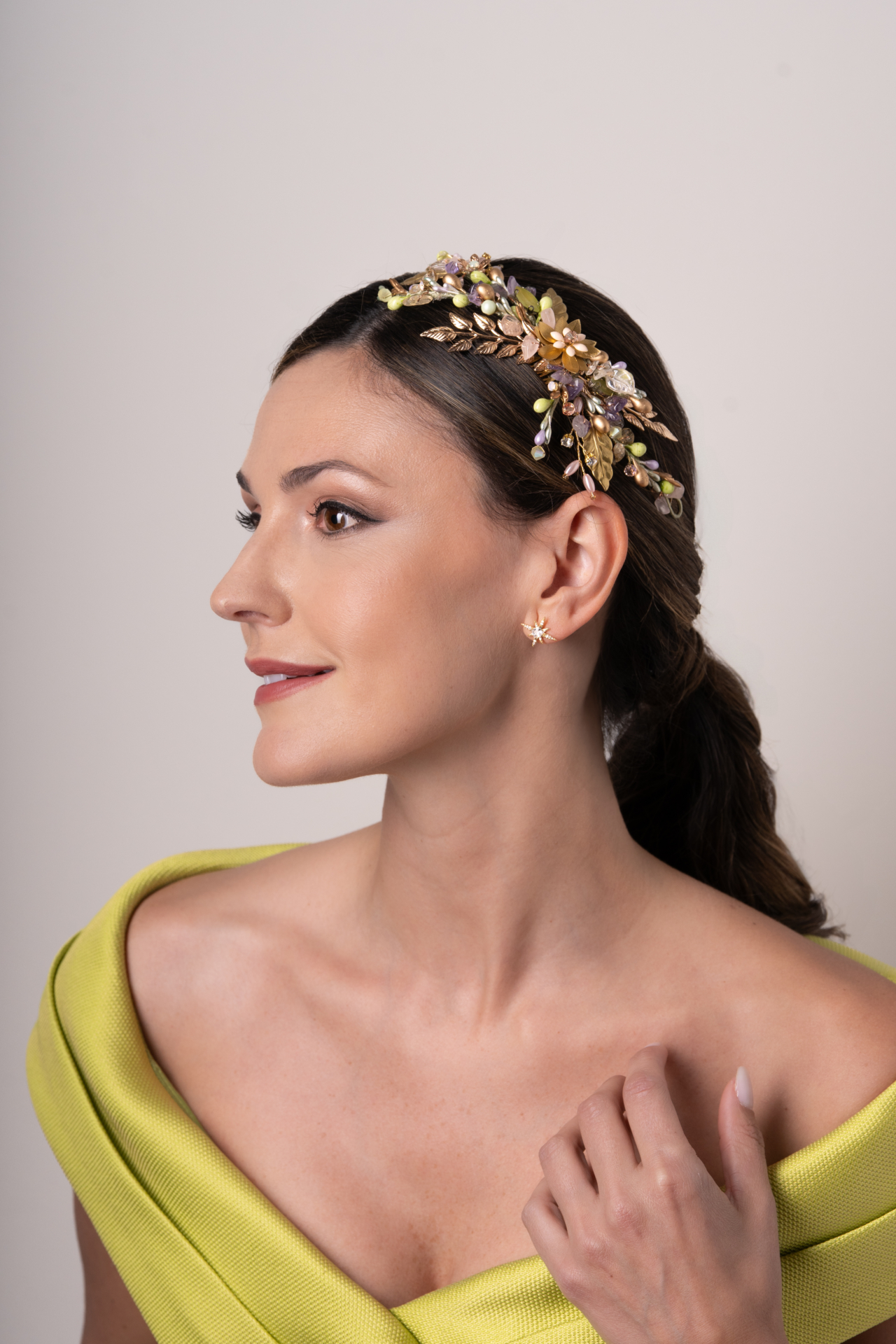 Tocado tipo joya joya en tonos verdes y dorados con toque nacarados. Diseño con ramitas de pistilos, bolitas y brillos. Realzando el diseño unas hojas de metal dorado y una variedad de florecillas. Med. 18cm. Aprox.