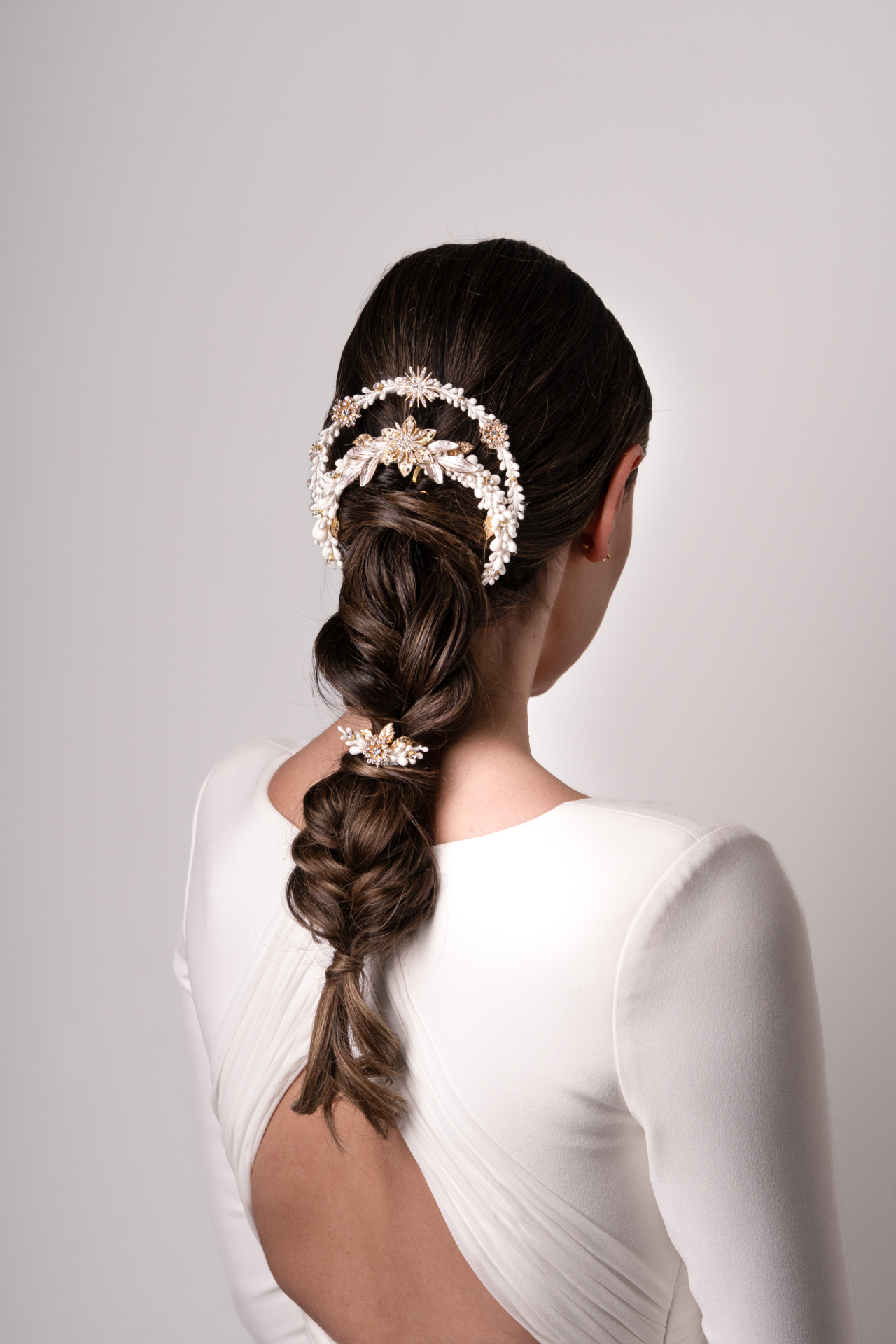 Coletero medialuna en pistilitos y estrellitas de metal dorado. Este tocado se adapta perfectamente a la forma del peinado y lo resalta. Lleva chatones para dar brillo. A juego un ganchillo ideal para acompañar. Med 11,5cm. X 11cm. Aprox.
