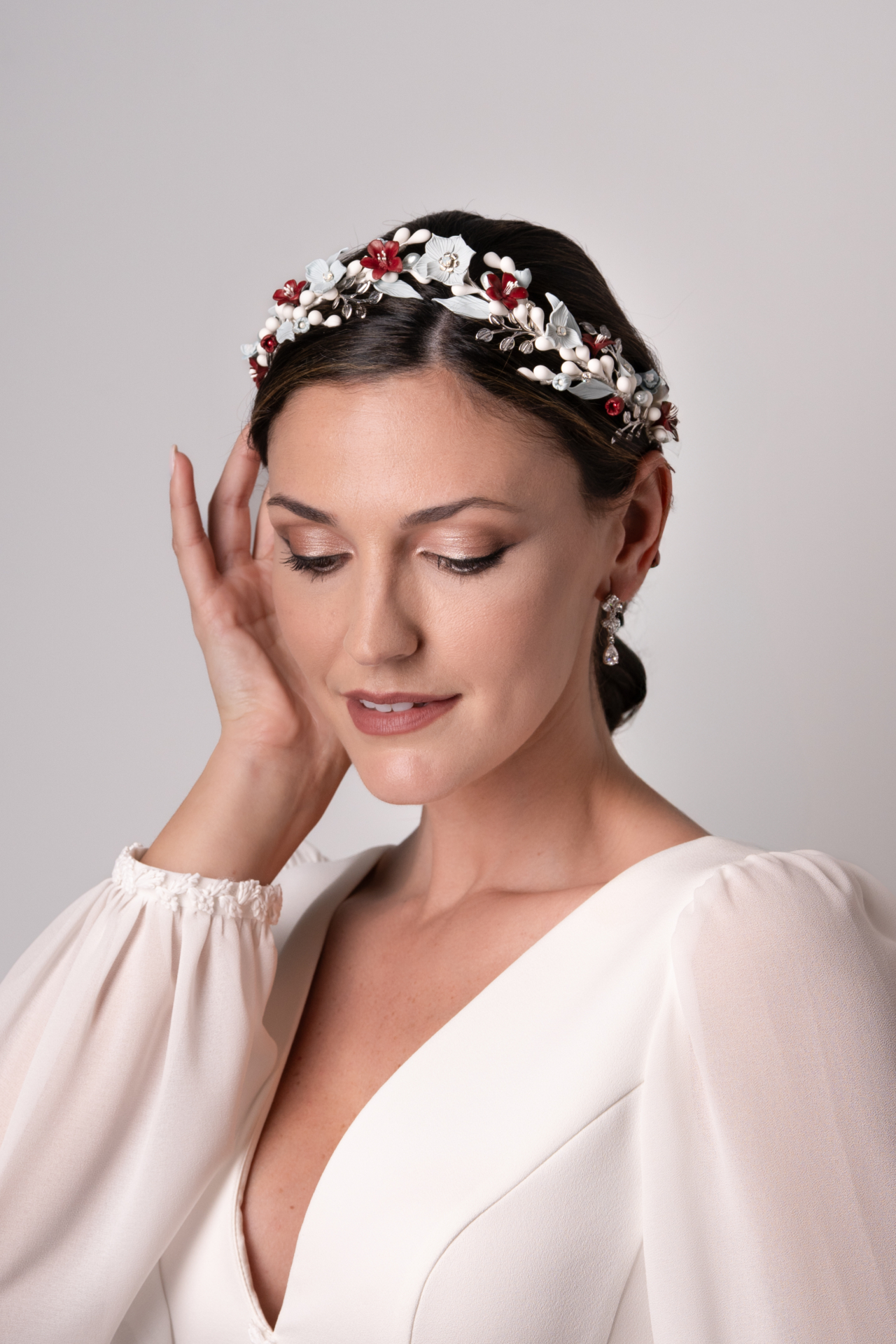 Tiara de porcelana y pistilos en tonos blanco, celeste y granate. Este tocado lleva una variedad de flores en porcelana hechas a mano en diferentes medidas al igual que las hojas. Lleva un toque de ramitas de metal plateado y chatones que aportan el brillo. Med. 32cm. X 4cm. Aprox.