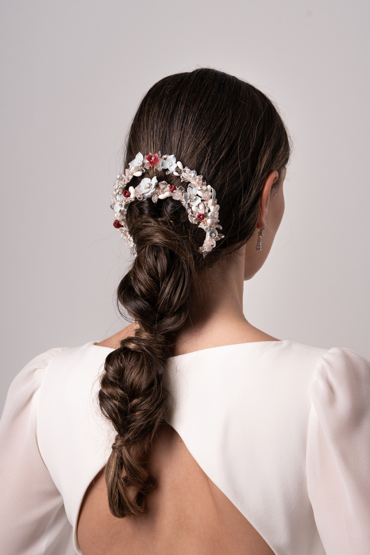 Coletero medialuna en cristales translucidos y flores de porcelana hechas a mano en tonos celeste y granate. Esta forma es perfecta para adaptarla al peinado y realzarlo. Med. 13cm. X 12,5cm. Aprox.