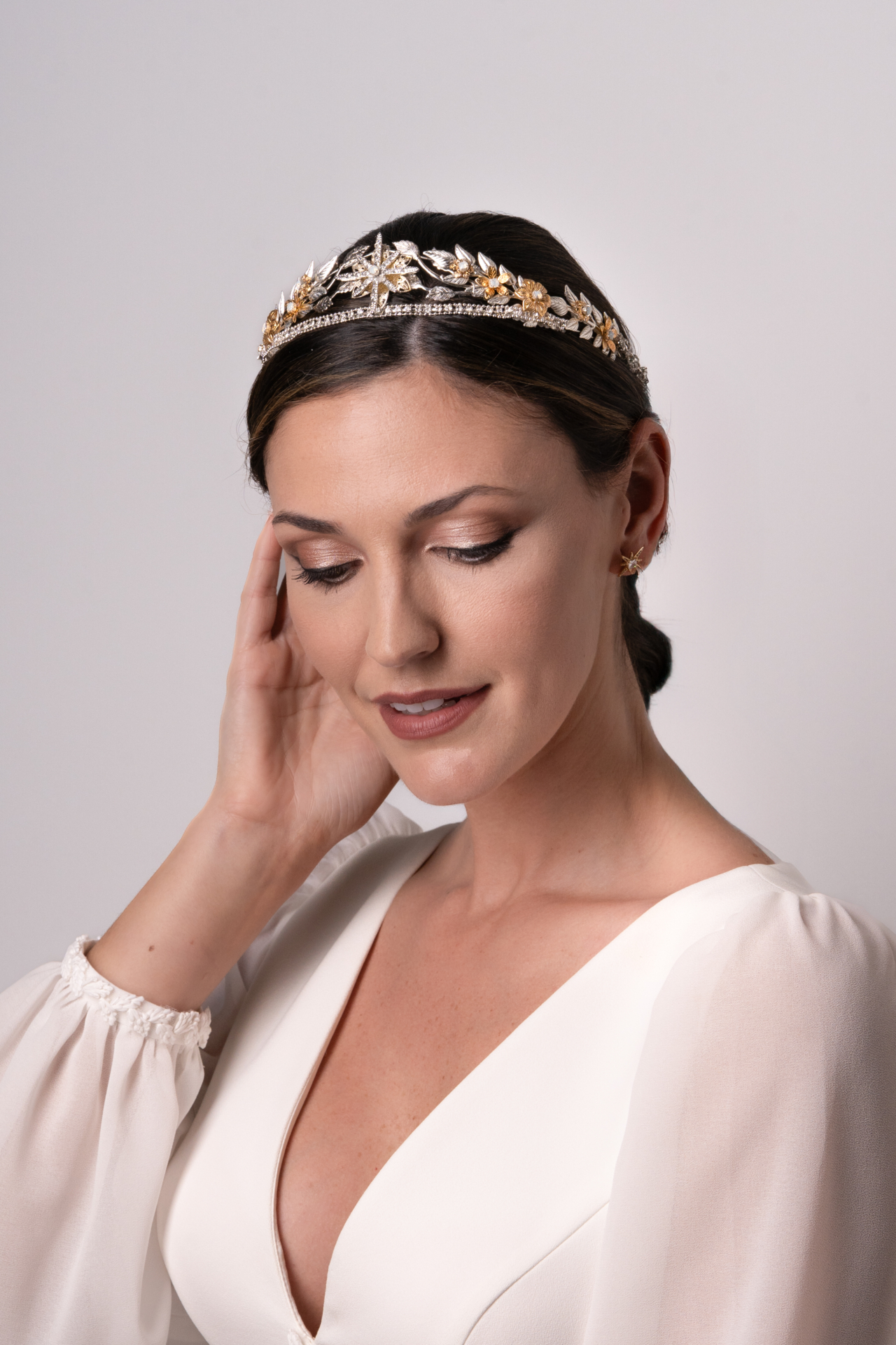 Tiara de metal plateado y dorado con estrella central, florecillas y ramas que dan forma al tocado. Es un diseño sencillo pero da luz al peinado. Med. 36cm. X 3,5cm. Aprox.